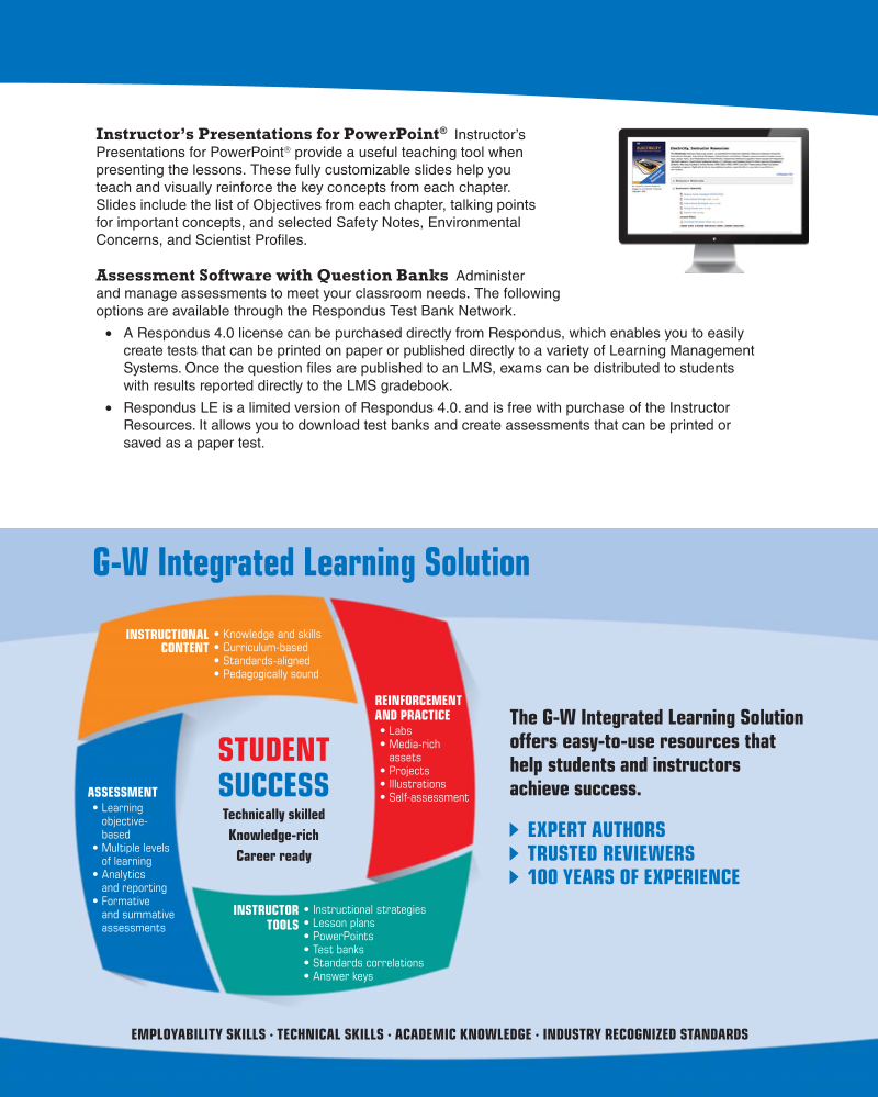 Instructor’s Presentations for PowerPoint® Instructor’s Presentations for PowerPoint® provide a useful teaching tool when presenting the lessons. These fully customizable slides help you teach and visually reinforce the key concepts from each chapter. Slides include the list of Objectives from each chapter, talking points for important concepts, and selected Safety Notes, Environmental Concerns, and Scientist Profiles. Assessment Software with Question Banks Administer and manage assessments to meet your classroom needs. The following options are available through the Respondus Test Bank Network. • A Respondus 4.0 license can be purchased directly from Respondus, which enables you to easily create tests that can be printed on paper or published directly to a variety of Learning Management Systems. Once the question files are published to an LMS, exams can be distributed to students with results reported directly to the LMS gradebook. • Respondus LE is a limited version of Respondus 4.0. and is free with purchase of the Instructor Resources. It allows you to download test banks and create assessments that can be printed or saved as a paper test. EMPLOYABILITY SKILLS ∙ TECHNICAL SKILLS ∙ ACADEMIC KNOWLEDGE ∙ INDUSTRY RECOGNIZED STANDARDS The G-W Integrated Learning Solution offers easy-to-use resources that help students and instructors achieve success. EXPERT AUTHORS TRUSTED REVIEWERS 100 YEARS OF EXPERIENCE G-W Integrated Learning Solution ASSESSMENT • Learning objective- based • Multiple levels of learning • Analytics and reporting • Formative and summative assessments • Knowledge and skills • Curriculum-based • Standards-aligned • Pedagogically sound INSTRUCTIONAL CONTENT INSTRUCTOR TOOLS • Instructional strategies • Lesson plans • PowerPoints • Test banks • Standards correlations • Answer keys REINFORCEMENT AND PRACTICE • Labs • Media-rich assets • Projects • Illustrations • Self-assessment STUDENT SUCCESS Technically skilled Knowledge-rich Career ready