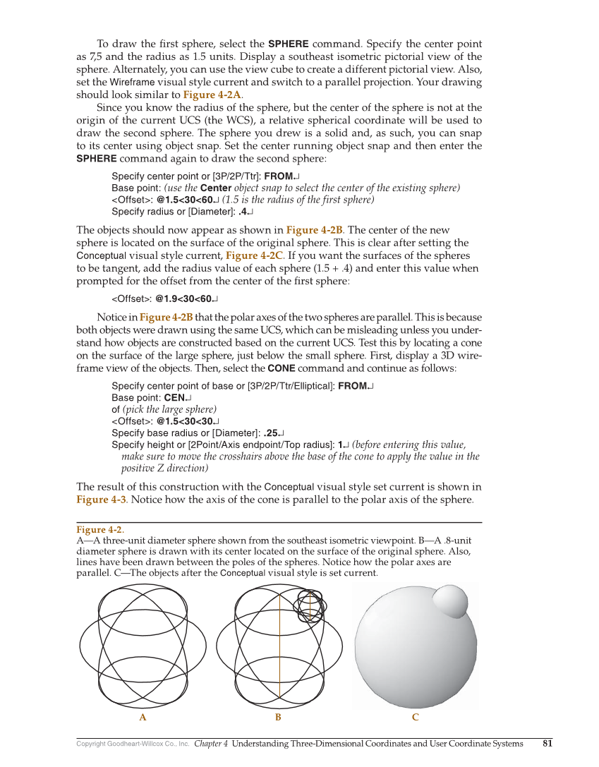 Copyright Goodheart-Willcox Co., Inc. Chapter 4 Understanding Three-Dimensional Coordinates and User Coordinate Systems 81 To draw the fi rst sphere, select the SPHERE command. Specify the center point as 7,5 and the radius as 1.5 units. Display a southeast isometric pictorial view of the sphere. Alternately, you can use the view cube to create a different pictorial view. Also, set the Wireframe visual style current and switch to a parallel projection. Your drawing should look similar to Figure 4-2A. Since you know the radius of the sphere, but the center of the sphere is not at the origin of the current UCS (the WCS), a relative spherical coordinate will be used to draw the second sphere. The sphere you drew is a solid and, as such, you can snap to its center using object snap. Set the center running object snap and then enter the SPHERE command again to draw the second sphere: Specify center point or [3P/2P/Ttr]: FROM↵ Base point: (use the Center object snap to select the center of the existing sphere) Offset: @1.53060↵ (1.5 is the radius of the first sphere) Specify radius or [Diameter]: .4↵ The objects should now appear as shown in Figure 4-2B. The center of the new sphere is located on the surface of the original sphere. This is clear after setting the Conceptual visual style current, Figure 4-2C. If you want the surfaces of the spheres to be tangent, add the radius value of each sphere (1.5 + .4) and enter this value when prompted for the offset from the center of the fi rst sphere: Offset: @1.93060↵ Notice in Figure 4-2B that the polar axes of the two spheres are parallel. This is because both objects were drawn using the same UCS, which can be misleading unless you under- stand how objects are constructed based on the current UCS. Test this by locating a cone on the surface of the large sphere, just below the small sphere. First, display a 3D wire- frame view of the objects. Then, select the CONE command and continue as follows: Specify center point of base or [3P/2P/Ttr/Elliptical]: FROM↵ Base point: CEN↵ of (pick the large sphere) Offset: @1.53030↵ Specify base radius or [Diameter]: .25↵ Specify height or [2Point/Axis endpoint/Top radius]: 1↵ (before entering this value, make sure to move the crosshairs above the base of the cone to apply the value in the positive Z direction) The result of this construction with the Conceptual visual style set current is shown in Figure 4-3. Notice how the axis of the cone is parallel to the polar axis of the sphere. A B C Figure 4-2. A—A three-unit diameter sphere shown from the southeast isometric viewpoint. B—A .8-unit diameter sphere is drawn with its center located on the surface of the original sphere. Also, lines have been drawn between the poles of the spheres. Notice how the polar axes are parallel. C—The objects after the Conceptual visual style is set current.