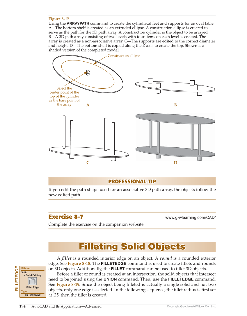 Copyright Goodheart-Willcox Co., Inc. 194 AutoCAD and Its Applications—Advanced PROFESSIONAL TIP PROFESSIONAL TIP If you edit the path shape used for an associative 3D path array, the objects follow the new edited path. Ex ercise 8-7 www.g-wlearning.com/CAD/ Complete the exercise on the companion website. Filleting Solid Objects Filleting Solid Objects A fi llet is a rounded interior edge on an object. A round is a rounded exterior edge. See Figure 8-18. The FILLETEDGE command is used to create fi llets and rounds on 3D objects. Additionally, the FILLET command can be used to fi llet 3D objects. Before a fi llet or round is created at an intersection, the solid objects that intersect need to be joined using the UNION command. Then, use the FILLETEDGE command. See Figure 8-19. Since the object being fi lleted is actually a single solid and not two objects, only one edge is selected. In the following sequence, the fi llet radius is fi rst set at .25, then the fi llet is created. FILLETEDGE Ribbon Solid Solid Editing Fillet Edge Type FILLETEDGE A C B D Construction ellipse Select the center point of the top of the cylinder as the base point of the array Figure 8-17. Using the ARRAYPATH command to create the cylindrical feet and supports for an oval table. A—The bottom shelf is created as an extruded ellipse. A construction ellipse is created to serve as the path for the 3D path array. A construction cylinder is the object to be arrayed. B—A 3D path array consisting of two levels with four items on each level is created. The array is created as a non-associative array. C—The supports are edited to the correct diameter and height. D—The bottom shelf is copied along the Z axis to create the top. Shown is a shaded version of the completed model.