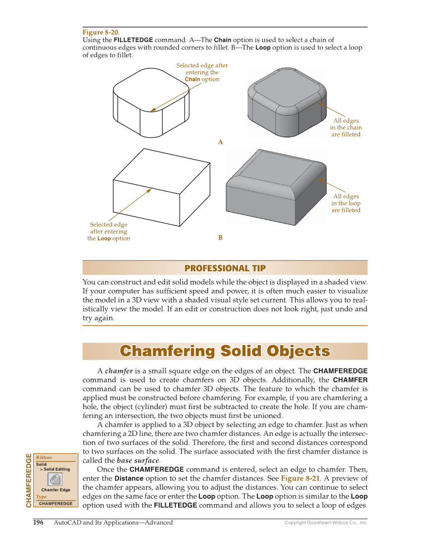 Copyright Goodheart-Willcox Co., Inc. 196 AutoCAD and Its Applications—Advanced PROFESSIONAL TIP PROFESSIONAL TIP You can construct and edit solid models while the object is displayed in a shaded view. If your computer has suffi cient speed and power, it is often much easier to visualize the model in a 3D view with a shaded visual style set current. This allows you to real- istically view the model. If an edit or construction does not look right, just undo and try again. Chamfering Solid Objects Chamfering Solid Objects A chamfer is a small square edge on the edges of an object. The CHAMFEREDGE command is used to create chamfers on 3D objects. Additionally, the CHAMFER command can be used to chamfer 3D objects. The feature to which the chamfer is applied must be constructed before chamfering. For example, if you are chamfering a hole, the object (cylinder) must fi rst be subtracted to create the hole. If you are cham- fering an intersection, the two objects must fi rst be unioned. A chamfer is applied to a 3D object by selecting an edge to chamfer. Just as when chamfering a 2D line, there are two chamfer distances. An edge is actually the intersec- tion of two surfaces of the solid. Therefore, the fi rst and second distances correspond to two surfaces on the solid. The surface associated with the fi rst chamfer distance is called the base surface. Once the CHAMFEREDGE command is entered, select an edge to chamfer. Then, enter the Distance option to set the chamfer distances. See Figure 8-21. A preview of the chamfer appears, allowing you to adjust the distances. You can continue to select edges on the same face or enter the Loop option. The Loop option is similar to the Loop option used with the FILLETEDGE command and allows you to select a loop of edges. CHAMFEREDGE Ribbon Solid Solid Editing Chamfer Edge Type CHAMFEREDGE Selected edge after entering the Chain option A B All edges in the chain are filleted All edges in the loop are filleted Selected edge after entering the Loop option Figure 8-20. Using the FILLETEDGE command. A—The Chain option is used to select a chain of continuous edges with rounded corners to fillet. B—The Loop option is used to select a loop of edges to fillet.
