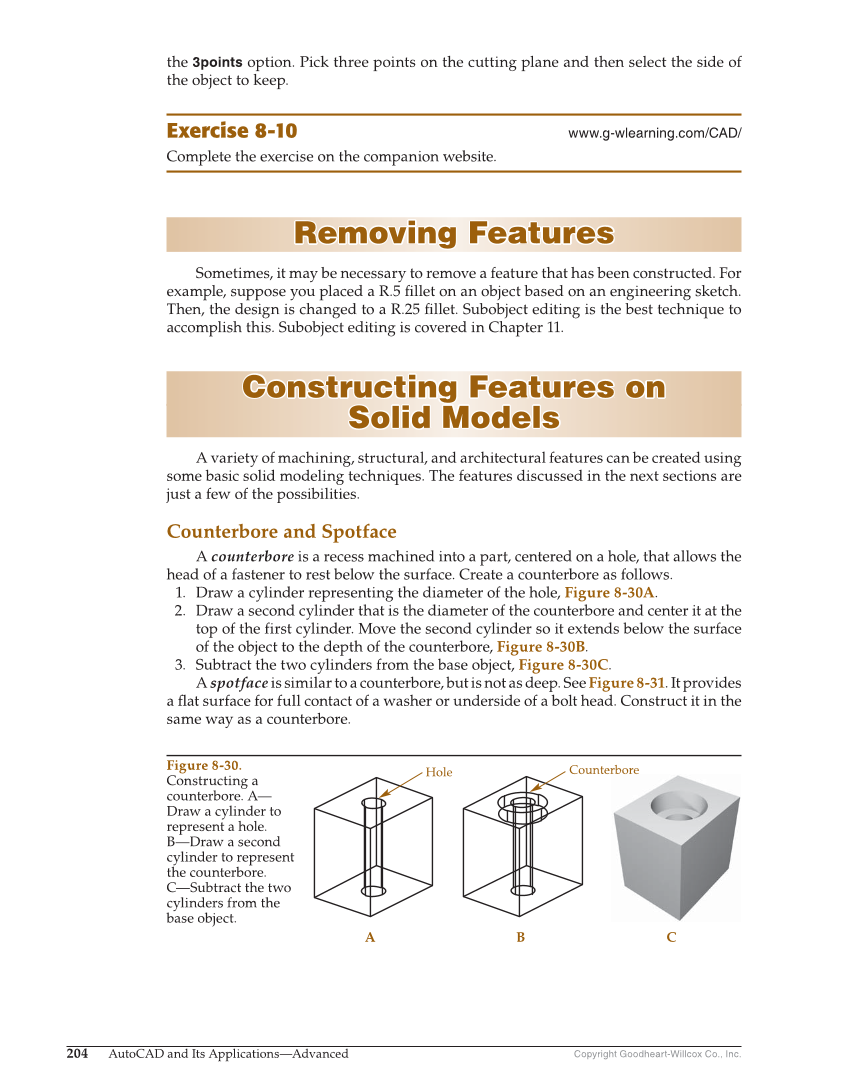 Copyright Goodheart-Willcox Co., Inc. 204 AutoCAD and Its Applications—Advanced Hole A B C Counterbore Figure 8-30. Constructing a counterbore. A— Draw a cylinder to represent a hole. B—Draw a second cylinder to represent the counterbore. C—Subtract the two cylinders from the base object. the 3points option. Pick three points on the cutting plane and then select the side of the object to keep. Exercise 8-10 www.g-wlearning.com/CAD/ Complete the exercise on the companion website. Removing Features Removing Features Sometimes, it may be necessary to remove a feature that has been constructed. For example, suppose you placed a R.5 fi llet on an object based on an engineering sketch. Then, the design is changed to a R.25 fi llet. Subobject editing is the best technique to accomplish this. Subobject editing is covered in Chapter 11. Constructing Features on Constructing Features on Solid Models Solid Models A variety of machining, structural, and architectural features can be created using some basic solid modeling techniques. The features discussed in the next sections are just a few of the possibilities. Counterbore and Spotface A counterbore is a recess machined into a part, centered on a hole, that allows the head of a fastener to rest below the surface. Create a counterbore as follows. 1. Draw a cylinder representing the diameter of the hole, Figure 8-30A. 2. Draw a second cylinder that is the diameter of the counterbore and center it at the top of the first cylinder. Move the second cylinder so it extends below the surface of the object to the depth of the counterbore, Figure 8-30B. 3. Subtract the two cylinders from the base object, Figure 8-30C. A spotface is similar to a counterbore, but is not as deep. See Figure 8-31. It provides a fl at surface for full contact of a washer or underside of a bolt head. Construct it in the same way as a counterbore.