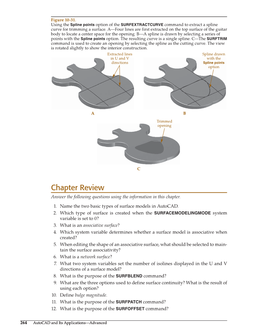 264 AutoCAD and Its Applications—Advanced 264 AutoCAD and Its Applications—Advanced Chapter Review Answer the following questions using the information in this chapter. 1. Name the two basic types of surface models in AutoCAD. 2. Which type of surface is created when the SURFACEMODELINGMODE system variable is set to 0? 3. What is an associative surface? 4. Which system variable determines whether a surface model is associative when created? 5. When editing the shape of an associative surface, what should be selected to main- tain the surface associativity? 6. What is a network surface? 7. What two system variables set the number of isolines displayed in the U and V directions of a surface model? 8. What is the purpose of the SURFBLEND command? 9. What are the three options used to define surface continuity? What is the result of using each option? 10. Define bulge magnitude. 11. What is the purpose of the SURFPATCH command? 12. What is the purpose of the SURFOFFSET command? Extracted lines in U and V directions Spline drawn with the Spline points option A B C Trimmed opening Figure 10-31. Using the Spline points option of the SURFEXTRACTCURVE command to extract a spline curve for trimming a surface. A—Four lines are first extracted on the top surface of the guitar body to locate a center space for the opening. B—A spline is drawn by selecting a series of points with the Spline points option. The resulting curve is a single spline. C—The SURFTRIM command is used to create an opening by selecting the spline as the cutting curve. The view is rotated slightly to show the interior construction.
