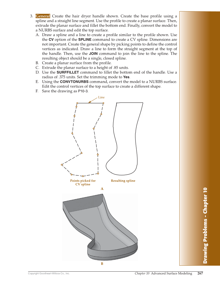 Drawing Problems - Chapter 10 Copyright Goodheart-Willcox Co., Inc. Chapter 10 Advanced Surface Modeling 267 3. General Create the hair dryer handle shown. Create the base profile using a spline and a straight line segment. Use the profile to create a planar surface. Then, extrude the planar surface and fillet the bottom end. Finally, convert the model to a NURBS surface and edit the top surface. A. Draw a spline and a line to create a profile similar to the profile shown. Use the CV option of the SPLINE command to create a CV spline. Dimensions are not important. Create the general shape by picking points to define the control vertices as indicated. Draw a line to form the straight segment at the top of the handle. Then, use the JOIN command to join the line to the spline. The resulting object should be a single, closed spline. B. Create a planar surface from the profile. C. Extrude the planar surface to a height of .85 units. D. Use the SURFFILLET command to fillet the bottom end of the handle. Use a radius of .375 units. Set the trimming mode to Yes. E. Using the CONVTONURBS command, convert the model to a NURBS surface. Edit the control vertices of the top surface to create a different shape. F. Save the drawing as P10-3. Line A B Points picked for CV spline Resulting spline