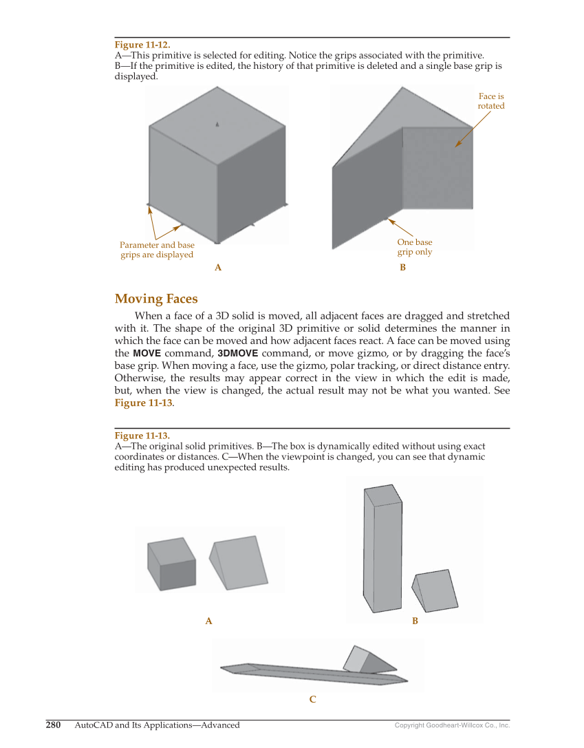 Copyright Goodheart-Willcox Co., Inc. 280 AutoCAD and Its Applications—Advanced Moving Faces When a face of a 3D solid is moved, all adjacent faces are dragged and stretched with it. The shape of the original 3D primitive or solid determines the manner in which the face can be moved and how adjacent faces react. A face can be moved using the MOVE command, 3DMOVE command, or move gizmo, or by dragging the face’s base grip. When moving a face, use the gizmo, polar tracking, or direct distance entry. Otherwise, the results may appear correct in the view in which the edit is made, but, when the view is changed, the actual result may not be what you wanted. See Figure 11-13. Parameter and base grips are displayed One base grip only A B Face is rotated Figure 11-12. A—This primitive is selected for editing. Notice the grips associated with the primitive. B—If the primitive is edited, the history of that primitive is deleted and a single base grip is displayed. A B C Figure 11-13. A—The original solid primitives. B—The box is dynamically edited without using exact coordinates or distances. C—When the viewpoint is changed, you can see that dynamic editing has produced unexpected results.