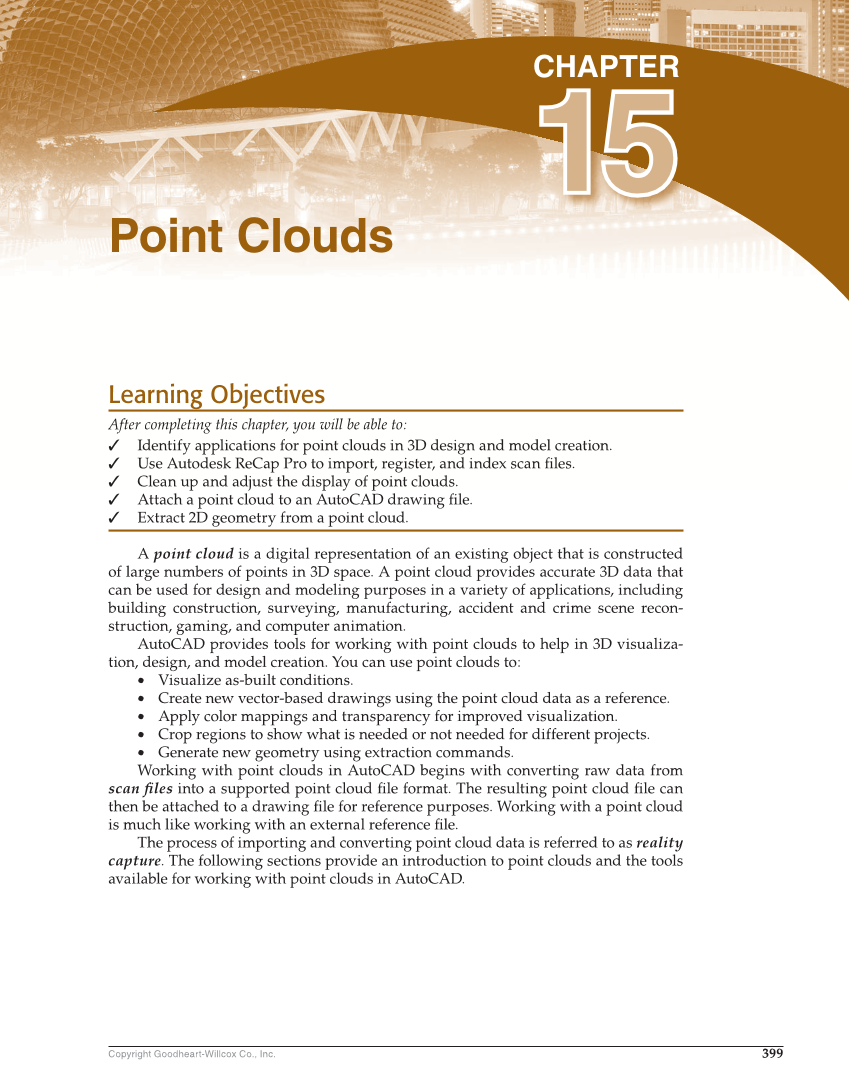 399 Copyright Goodheart-Willcox Co., Inc. Learning Objectives After completing this chapter, you will be able to: ✓ Identify applications for point clouds in 3D design and model creation. ✓ Use Autodesk ReCap Pro to import, register, and index scan fi les. ✓ Clean up and adjust the display of point clouds. ✓ Attach a point cloud to an AutoCAD drawing fi le. ✓ Extract 2D geometry from a point cloud. A point cloud is a digital representation of an existing object that is constructed of large numbers of points in 3D space. A point cloud provides accurate 3D data that can be used for design and modeling purposes in a variety of applications, including building construction, surveying, manufacturing, accident and crime scene recon- struction, gaming, and computer animation. AutoCAD provides tools for working with point clouds to help in 3D visualiza- tion, design, and model creation. You can use point clouds to: • Visualize as-built conditions. • Create new vector-based drawings using the point cloud data as a reference. • Apply color mappings and transparency for improved visualization. • Crop regions to show what is needed or not needed for different projects. • Generate new geometry using extraction commands. Working with point clouds in AutoCAD begins with converting raw data from scan fi les into a supported point cloud fi le format. The resulting point cloud fi le can then be attached to a drawing fi le for reference purposes. Working with a point cloud is much like working with an external reference fi le. The process of importing and converting point cloud data is referred to as reality capture. The following sections provide an introduction to point clouds and the tools available for working with point clouds in AutoCAD. Point Clouds CHAPTER 15 15