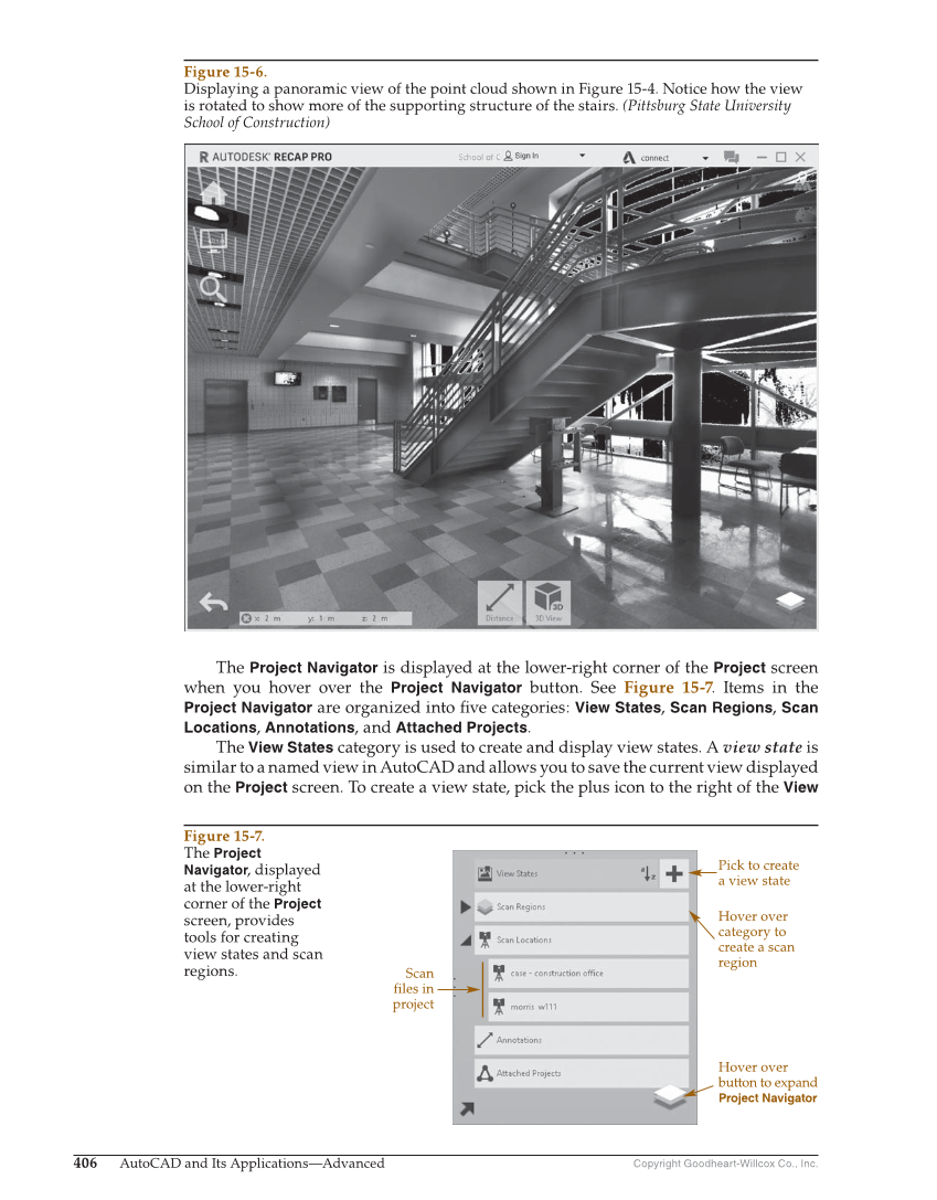 Copyright Goodheart-Willcox Co., Inc. 406 AutoCAD and Its Applications—Advanced The Project Navigator is displayed at the lower-right corner of the Project screen when you hover over the Project Navigator button. See Figure 15-7. Items in the Project Navigator are organized into fi ve categories: View States, Scan Regions, Scan Locations, Annotations, and Attached Projects. The View States category is used to create and display view states. A view state is similar to a named view in AutoCAD and allows you to save the current view displayed on the Project screen. To create a view state, pick the plus icon to the right of the View Figure 15-6. Displaying a panoramic view of the point cloud shown in Figure 15-4. Notice how the view is rotated to show more of the supporting structure of the stairs. (Pittsburg State University School of Construction) Pick to create a view state Hover over category to create a scan region Hover over button to expand Project Navigator Scan files in project Figure 15-7. The Project Navigator, displayed at the lower-right corner of the Project screen, provides tools for creating view states and scan regions.