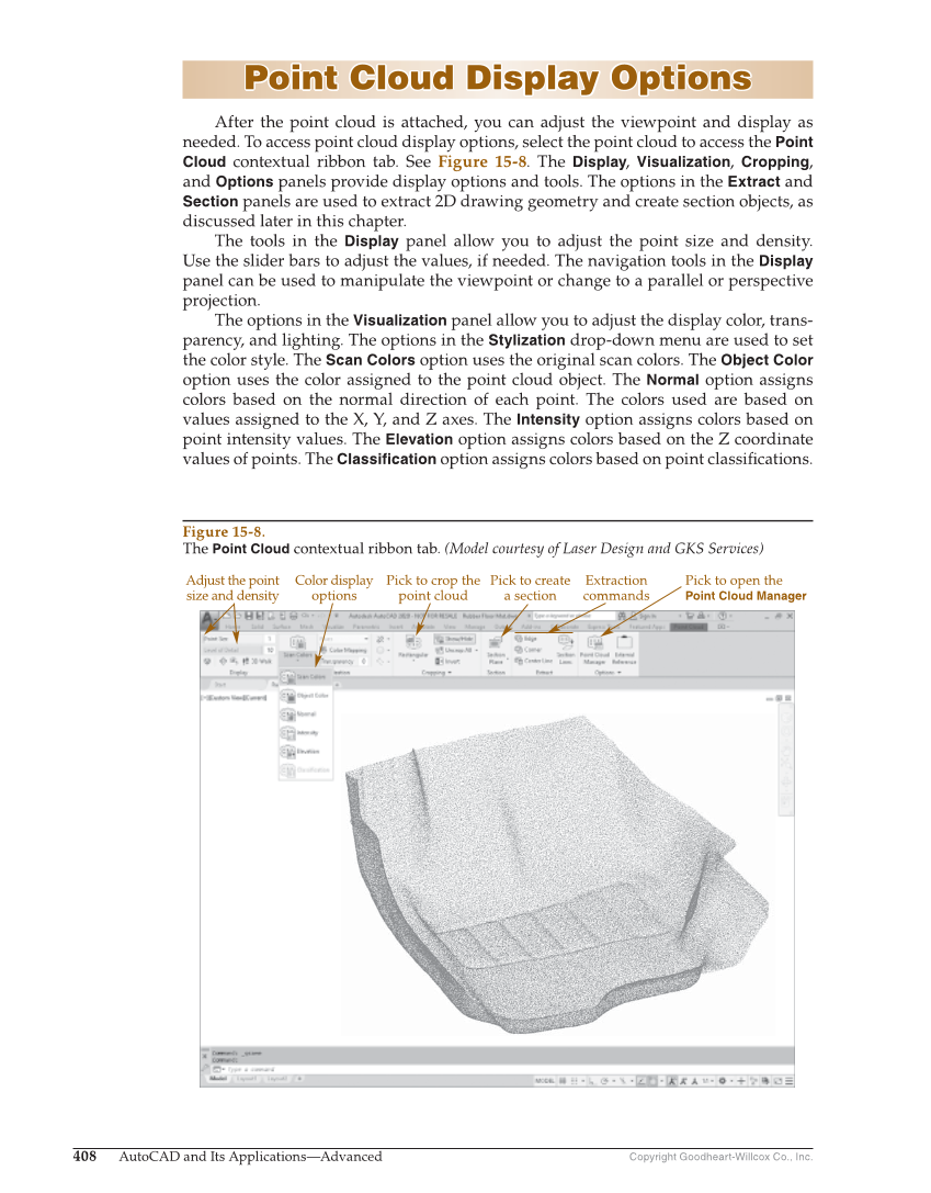 Copyright Goodheart-Willcox Co., Inc. 408 AutoCAD and Its Applications—Advanced Point Cloud Display Options Point Cloud Display Options After the point cloud is attached, you can adjust the viewpoint and display as needed. To access point cloud display options, select the point cloud to access the Point Cloud contextual ribbon tab. See Figure 15-8. The Display, Visualization, Cropping, and Options panels provide display options and tools. The options in the Extract and Section panels are used to extract 2D drawing geometry and create section objects, as discussed later in this chapter. The tools in the Display panel allow you to adjust the point size and density. Use the slider bars to adjust the values, if needed. The navigation tools in the Display panel can be used to manipulate the viewpoint or change to a parallel or perspective projection. The options in the Visualization panel allow you to adjust the display color, trans- parency, and lighting. The options in the Stylization drop-down menu are used to set the color style. The Scan Colors option uses the original scan colors. The Object Color option uses the color assigned to the point cloud object. The Normal option assigns colors based on the normal direction of each point. The colors used are based on values assigned to the X, Y, and Z axes. The Intensity option assigns colors based on point intensity values. The Elevation option assigns colors based on the Z coordinate values of points. The Classification option assigns colors based on point classifi cations. Adjust the point size and density Color display options Pick to crop the point cloud Pick to create a section Extraction commands Pick to open the Point Cloud Manager Figure 15-8. The Point Cloud contextual ribbon tab. (Model courtesy of Laser Design and GKS Services)