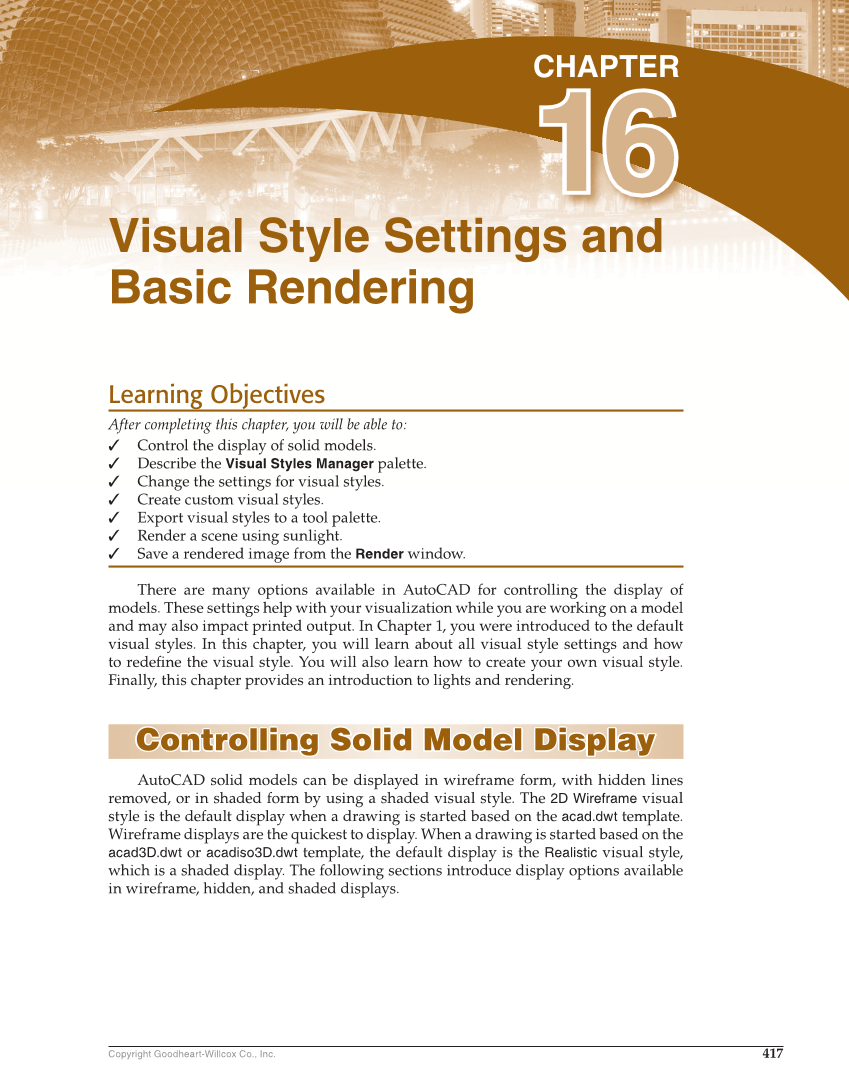 417 Copyright Goodheart-Willcox Co., Inc. Learning Objectives After completing this chapter, you will be able to: ✓ Control the display of solid models. ✓ Describe the Visual Styles Manager palette. ✓ Change the settings for visual styles. ✓ Create custom visual styles. ✓ Export visual styles to a tool palette. ✓ Render a scene using sunlight. ✓ Save a rendered image from the Render window. There are many options available in AutoCAD for controlling the display of models. These settings help with your visualization while you are working on a model and may also impact printed output. In Chapter 1, you were introduced to the default visual styles. In this chapter, you will learn about all visual style settings and how to redefi ne the visual style. You will also learn how to create your own visual style. Finally, this chapter provides an introduction to lights and rendering. Controlling Solid Model Display Controlling Solid Model Display AutoCAD solid models can be displayed in wireframe form, with hidden lines removed, or in shaded form by using a shaded visual style. The 2D Wireframe visual style is the default display when a drawing is started based on the acad.dwt template. Wireframe displays are the quickest to display. When a drawing is started based on the acad3D.dwt or acadiso3D.dwt template, the default display is the Realistic visual style, which is a shaded display. The following sections introduce display options available in wireframe, hidden, and shaded displays. Visual Style Settings and Basic Rendering CHAPTER 16 16
