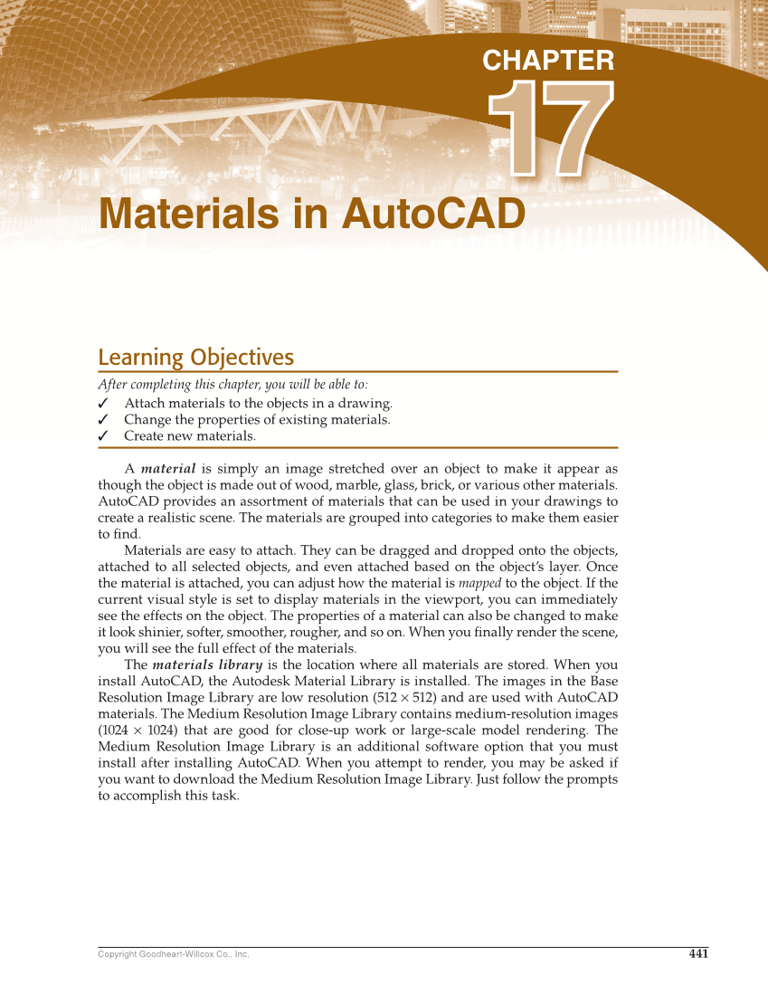 441 Copyright Goodheart-Willcox Co., Inc. Learning Objectives After completing this chapter, you will be able to: ✓ Attach materials to the objects in a drawing. ✓ Change the properties of existing materials. ✓ Create new materials. A material is simply an image stretched over an object to make it appear as though the object is made out of wood, marble, glass, brick, or various other materials. AutoCAD provides an assortment of materials that can be used in your drawings to create a realistic scene. The materials are grouped into categories to make them easier to fi nd. Materials are easy to attach. They can be dragged and dropped onto the objects, attached to all selected objects, and even attached based on the object’s layer. Once the material is attached, you can adjust how the material is mapped to the object. If the current visual style is set to display materials in the viewport, you can immediately see the effects on the object. The properties of a material can also be changed to make it look shinier, softer, smoother, rougher, and so on. When you fi nally render the scene, you will see the full effect of the materials. The materials library is the location where all materials are stored. When you install AutoCAD, the Autodesk Material Library is installed. The images in the Base Resolution Image Library are low resolution (512 × 512) and are used with AutoCAD materials. The Medium Resolution Image Library contains medium-resolution images (1024 × 1024) that are good for close-up work or large-scale model rendering. The Medium Resolution Image Library is an additional software option that you must install after installing AutoCAD. When you attempt to render, you may be asked if you want to download the Medium Resolution Image Library. Just follow the prompts to accomplish this task. Materials in AutoCAD CHAPTER 17 17