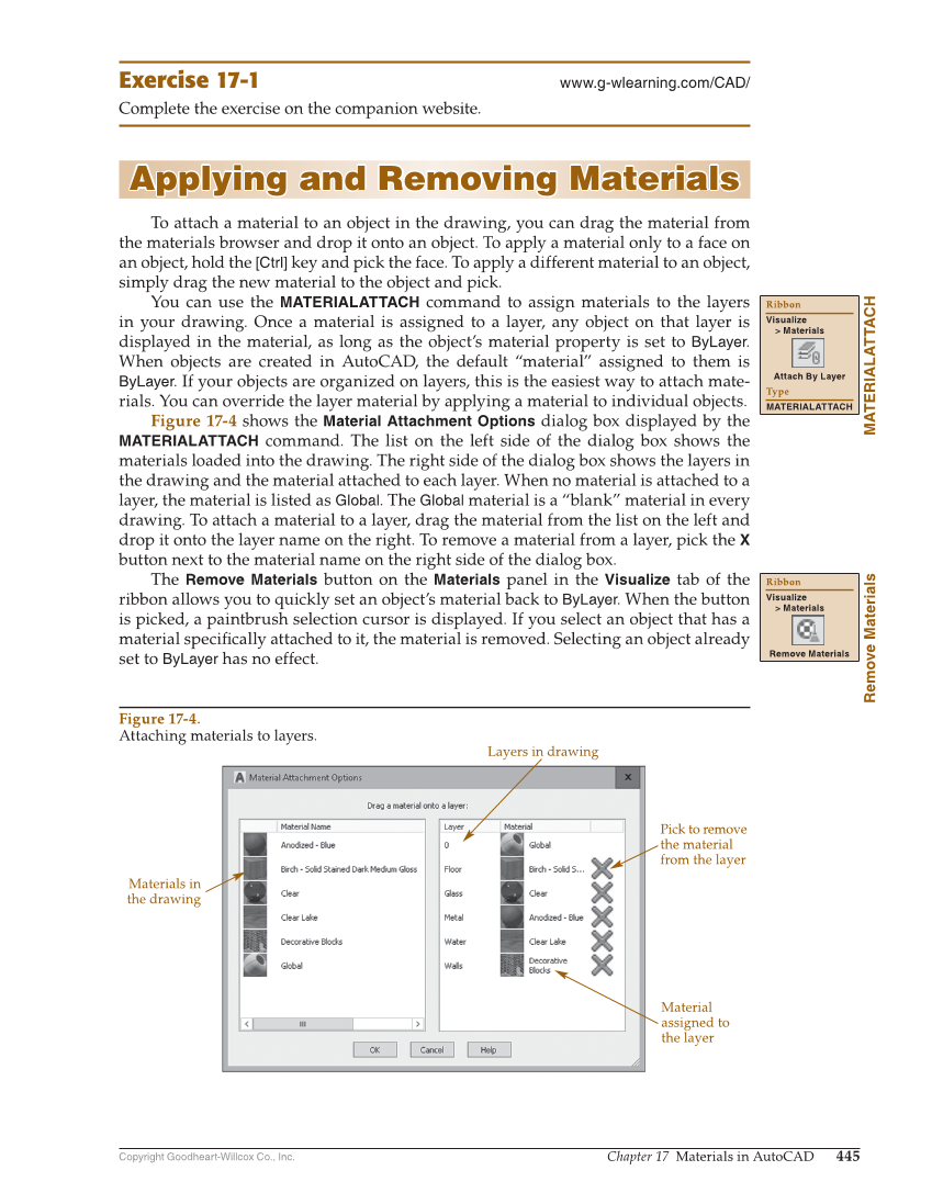 Copyright Goodheart-Willcox Co., Inc. Chapter 17 Materials in AutoCAD 445 Exercise 17-1 www.g-wlearning.com/CAD/ Complete the exercise on the companion website. Applying and Removing Materials Applying and Removing Materials To attach a material to an object in the drawing, you can drag the material from the materials browser and drop it onto an object. To apply a material only to a face on an object, hold the [Ctrl] key and pick the face. To apply a different material to an object, simply drag the new material to the object and pick. You can use the MATERIALATTACH command to assign materials to the layers in your drawing. Once a material is assigned to a layer, any object on that layer is displayed in the material, as long as the object’s material property is set to ByLayer. When objects are created in AutoCAD, the default “material” assigned to them is ByLayer. If your objects are organized on layers, this is the easiest way to attach mate- rials. You can override the layer material by applying a material to individual objects. Figure 17-4 shows the Material Attachment Options dialog box displayed by the MATERIALATTACH command. The list on the left side of the dialog box shows the materials loaded into the drawing. The right side of the dialog box shows the layers in the drawing and the material attached to each layer. When no material is attached to a layer, the material is listed as Global. The Global material is a “blank” material in every drawing. To attach a material to a layer, drag the material from the list on the left and drop it onto the layer name on the right. To remove a material from a layer, pick the X button next to the material name on the right side of the dialog box. The Remove Materials button on the Materials panel in the Visualize tab of the ribbon allows you to quickly set an object’s material back to ByLayer. When the button is picked, a paintbrush selection cursor is displayed. If you select an object that has a material specifi cally attached to it, the material is removed. Selecting an object already set to ByLayer has no effect. MATERIALATTACH Ribbon Visualize Materials Attach By Layer Type MATERIALATTACH Remove Materials Ribbon Visualize Materials Remove Materials Materials in the drawing Layers in drawing Pick to remove the material from the layer Material assigned to the layer Figure 17-4. Attaching materials to layers.
