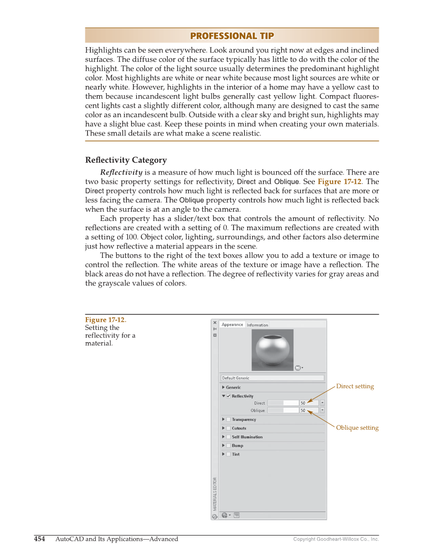 Copyright Goodheart-Willcox Co., Inc. 454 AutoCAD and Its Applications—Advanced PROFESSIONAL TIP PROFESSIONAL TIP Highlights can be seen everywhere. Look around you right now at edges and inclined surfaces. The diffuse color of the surface typically has little to do with the color of the highlight. The color of the light source usually determines the predominant highlight color. Most highlights are white or near white because most light sources are white or nearly white. However, highlights in the interior of a home may have a yellow cast to them because incandescent light bulbs generally cast yellow light. Compact fl uores- cent lights cast a slightly different color, although many are designed to cast the same color as an incandescent bulb. Outside with a clear sky and bright sun, highlights may have a slight blue cast. Keep these points in mind when creating your own materials. These small details are what make a scene realistic. Refl ectivity Category Refl ectivity is a measure of how much light is bounced off the surface. There are two basic property settings for refl ectivity, Direct and Oblique. See Figure 17-12. The Direct property controls how much light is refl ected back for surfaces that are more or less facing the camera. The Oblique property controls how much light is refl ected back when the surface is at an angle to the camera. Each property has a slider/text box that controls the amount of refl ectivity. No refl ections are created with a setting of 0. The maximum refl ections are created with a setting of 100. Object color, lighting, surroundings, and other factors also determine just how refl ective a material appears in the scene. The buttons to the right of the text boxes allow you to add a texture or image to control the refl ection. The white areas of the texture or image have a refl ection. The black areas do not have a refl ection. The degree of refl ectivity varies for gray areas and the grayscale values of colors. Direct setting Oblique setting Figure 17-12. Setting the reflectivity for a material.