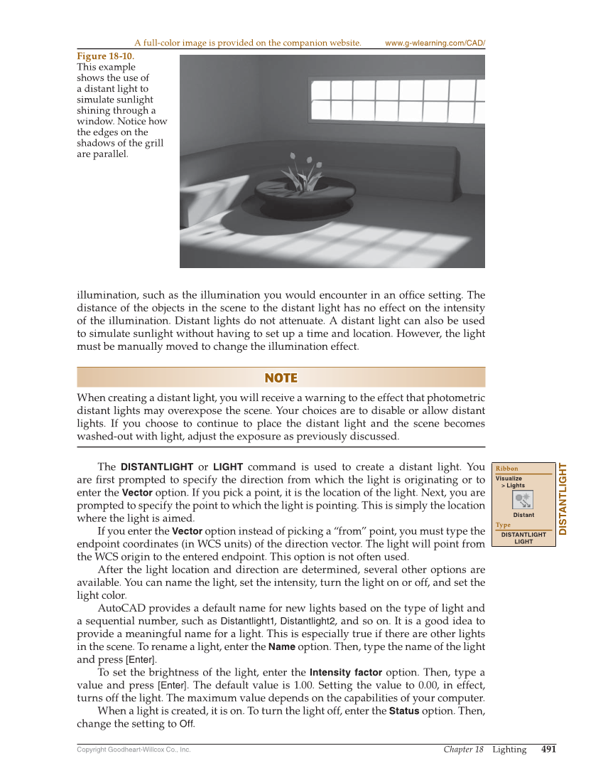 Copyright Goodheart-Willcox Co., Inc. Chapter 18 Lighting 491 illumination, such as the illumination you would encounter in an offi ce setting. The distance of the objects in the scene to the distant light has no effect on the intensity of the illumination. Distant lights do not attenuate. A distant light can also be used to simulate sunlight without having to set up a time and location. However, the light must be manually moved to change the illumination effect. NOTE NOTE When creating a distant light, you will receive a warning to the effect that photometric distant lights may overexpose the scene. Your choices are to disable or allow distant lights. If you choose to continue to place the distant light and the scene becomes washed-out with light, adjust the exposure as previously discussed. The DISTANTLIGHT or LIGHT command is used to create a distant light. You are fi rst prompted to specify the direction from which the light is originating or to enter the Vector option. If you pick a point, it is the location of the light. Next, you are prompted to specify the point to which the light is pointing. This is simply the location where the light is aimed. If you enter the Vector option instead of picking a “from” point, you must type the endpoint coordinates (in WCS units) of the direction vector. The light will point from the WCS origin to the entered endpoint. This option is not often used. After the light location and direction are determined, several other options are available. You can name the light, set the intensity, turn the light on or off, and set the light color. AutoCAD provides a default name for new lights based on the type of light and a sequential number, such as Distantlight1, Distantlight2, and so on. It is a good idea to provide a meaningful name for a light. This is especially true if there are other lights in the scene. To rename a light, enter the Name option. Then, type the name of the light and press [Enter]. To set the brightness of the light, enter the Intensity factor option. Then, type a value and press [Enter]. The default value is 1.00. Setting the value to 0.00, in effect, turns off the light. The maximum value depends on the capabilities of your computer. When a light is created, it is on. To turn the light off, enter the Status option. Then, change the setting to Off. DISTANTLIGHT Ribbon Visualize Lights Distant Type DISTANTLIGHT LIGHT Figure 18-10. This example shows the use of a distant light to simulate sunlight shining through a window. Notice how the edges on the shadows of the grill are parallel. A full-color image is provided on the companion website. www.g-wlearning.com/CAD/