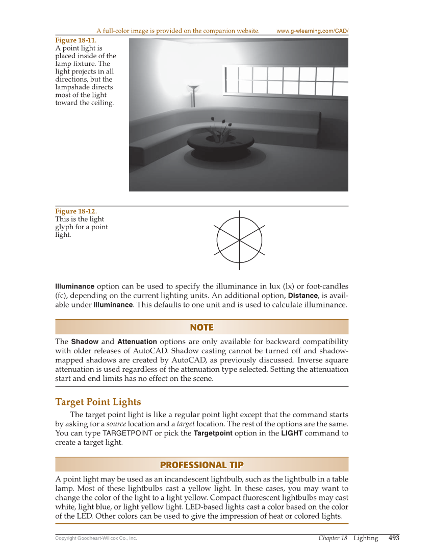 Copyright Goodheart-Willcox Co., Inc. Chapter 18 Lighting 493 Illuminance option can be used to specify the illuminance in lux (lx) or foot-candles (fc), depending on the current lighting units. An additional option, Distance, is avail- able under Illuminance. This defaults to one unit and is used to calculate illuminance. NOTE NOTE The Shadow and Attenuation options are only available for backward compatibility with older releases of AutoCAD. Shadow casting cannot be turned off and shadow- mapped shadows are created by AutoCAD, as previously discussed. Inverse square attenuation is used regardless of the attenuation type selected. Setting the attenuation start and end limits has no effect on the scene. Target Point Lights The target point light is like a regular point light except that the command starts by asking for a source location and a target location. The rest of the options are the same. You can type TARGETPOINT or pick the Targetpoint option in the LIGHT command to create a target light. PROFESSIONAL TIP PROFESSIONAL TIP A point light may be used as an incandescent lightbulb, such as the lightbulb in a table lamp. Most of these lightbulbs cast a yellow light. In these cases, you may want to change the color of the light to a light yellow. Compact fl uorescent lightbulbs may cast white, light blue, or light yellow light. LED-based lights cast a color based on the color of the LED. Other colors can be used to give the impression of heat or colored lights. Figure 18-11. A point light is placed inside of the lamp fixture. The light projects in all directions, but the lampshade directs most of the light toward the ceiling. A full-color image is provided on the companion website. www.g-wlearning.com/CAD/ Figure 18-12. This is the light glyph for a point light.