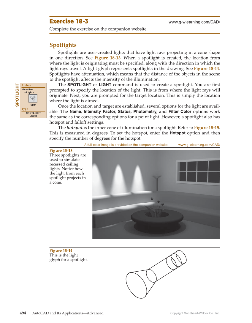 Copyright Goodheart-Willcox Co., Inc. 494 AutoCAD and Its Applications—Advanced Exercise 18-3 www.g-wlearning.com/CAD/ Complete the exercise on the companion website. Spotlights Spotlights are user-created lights that have light rays projecting in a cone shape in one direction. See Figure 18-13. When a spotlight is created, the location from where the light is originating must be specifi ed, along with the direction in which the light rays travel. A light glyph represents spotlights in the drawing. See Figure 18-14. Spotlights have attenuation, which means that the distance of the objects in the scene to the spotlight affects the intensity of the illumination. The SPOTLIGHT or LIGHT command is used to create a spotlight. You are fi rst prompted to specify the location of the light. This is from where the light rays will originate. Next, you are prompted for the target location. This is simply the location where the light is aimed. Once the location and target are established, several options for the light are avail- able. The Name, Intensity Factor, Status, Photometry, and Filter Color options work the same as the corresponding options for a point light. However, a spotlight also has hotspot and falloff settings. The hotspot is the inner cone of illumination for a spotlight. Refer to Figure 18-15. This is measured in degrees. To set the hotspot, enter the Hotspot option and then specify the number of degrees for the hotspot. SPOTLIGHT Ribbon Visualize Lights Spot Type SPOTLIGHT LIGHT Figure 18-13. Three spotlights are used to simulate recessed ceiling lights. Notice how the light from each spotlight projects in a cone. A full-color image is provided on the companion website. www.g-wlearning.com/CAD/ Figure 18-14. This is the light glyph for a spotlight.