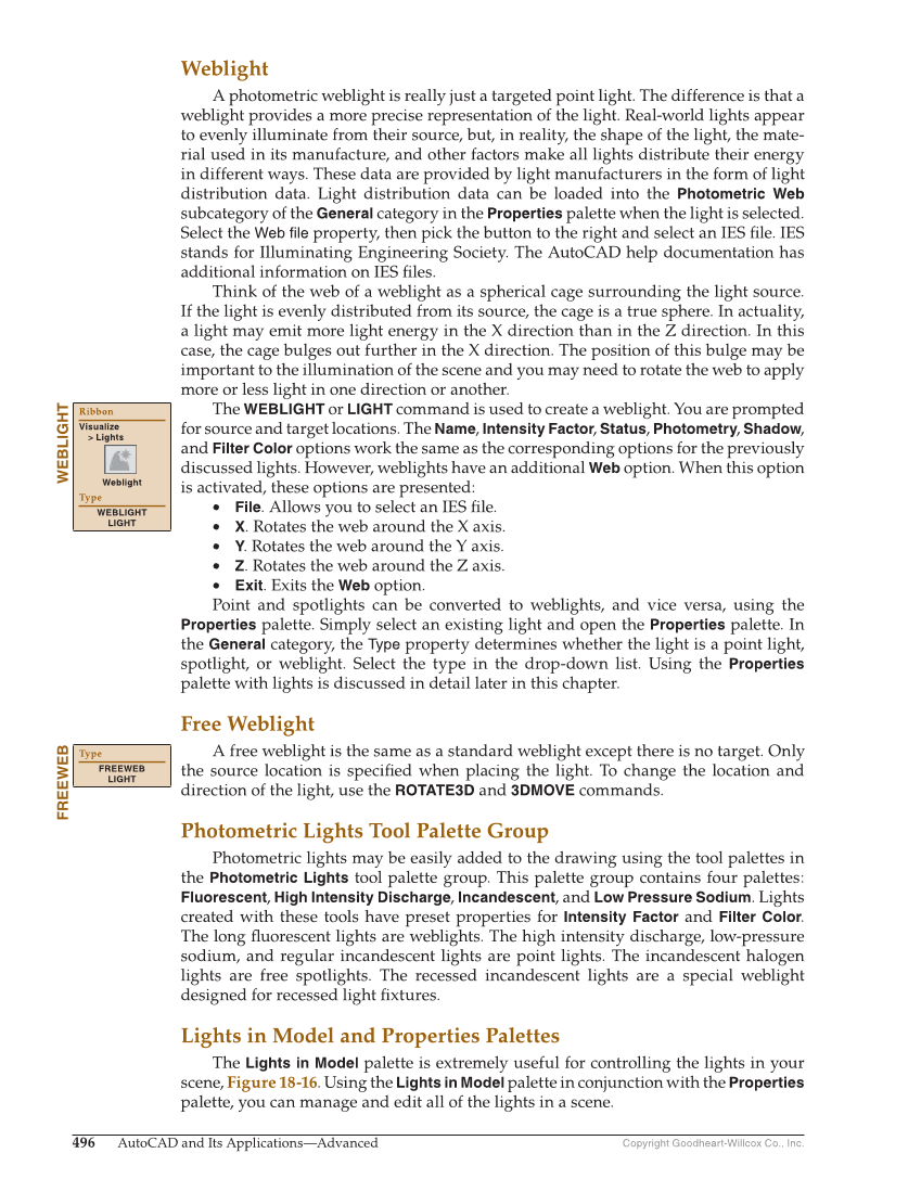 Copyright Goodheart-Willcox Co., Inc. 496 AutoCAD and Its Applications—Advanced Weblight A photometric weblight is really just a targeted point light. The difference is that a weblight provides a more precise representation of the light. Real-world lights appear to evenly illuminate from their source, but, in reality, the shape of the light, the mate- rial used in its manufacture, and other factors make all lights distribute their energy in different ways. These data are provided by light manufacturers in the form of light distribution data. Light distribution data can be loaded into the Photometric Web subcategory of the General category in the Properties palette when the light is selected. Select the Web file property, then pick the button to the right and select an IES fi le. IES stands for Illuminating Engineering Society. The AutoCAD help documentation has additional information on IES fi les. Think of the web of a weblight as a spherical cage surrounding the light source. If the light is evenly distributed from its source, the cage is a true sphere. In actuality, a light may emit more light energy in the X direction than in the Z direction. In this case, the cage bulges out further in the X direction. The position of this bulge may be important to the illumination of the scene and you may need to rotate the web to apply more or less light in one direction or another. The WEBLIGHT or LIGHT command is used to create a weblight. You are prompted for source and target locations. The Name, Intensity Factor, Status, Photometry, Shadow, and Filter Color options work the same as the corresponding options for the previously discussed lights. However, weblights have an additional Web option. When this option is activated, these options are presented: • File. Allows you to select an IES fi le. • X. Rotates the web around the X axis. • Y. Rotates the web around the Y axis. • Z. Rotates the web around the Z axis. • Exit. Exits the Web option. Point and spotlights can be converted to weblights, and vice versa, using the Properties palette. Simply select an existing light and open the Properties palette. In the General category, the Type property determines whether the light is a point light, spotlight, or weblight. Select the type in the drop-down list. Using the Properties palette with lights is discussed in detail later in this chapter. Free Weblight A free weblight is the same as a standard weblight except there is no target. Only the source location is specifi ed when placing the light. To change the location and direction of the light, use the ROTATE3D and 3DMOVE commands. Photometric Lights Tool Palette Group Photometric lights may be easily added to the drawing using the tool palettes in the Photometric Lights tool palette group. This palette group contains four palettes: Fluorescent, High Intensity Discharge, Incandescent, and Low Pressure Sodium. Lights created with these tools have preset properties for Intensity Factor and Filter Color. The long fl uorescent lights are weblights. The high intensity discharge, low-pressure sodium, and regular incandescent lights are point lights. The incandescent halogen lights are free spotlights. The recessed incandescent lights are a special weblight designed for recessed light fi xtures. Lights in Model and Properties Palettes The Lights in Model palette is extremely useful for controlling the lights in your scene, Figure 18-16. Using the Lights in Model palette in conjunction with the Properties palette, you can manage and edit all of the lights in a scene. WEBLIGHT Ribbon Visualize Lights Weblight Type WEBLIGHT LIGHT FREEWEB Type FREEWEB LIGHT