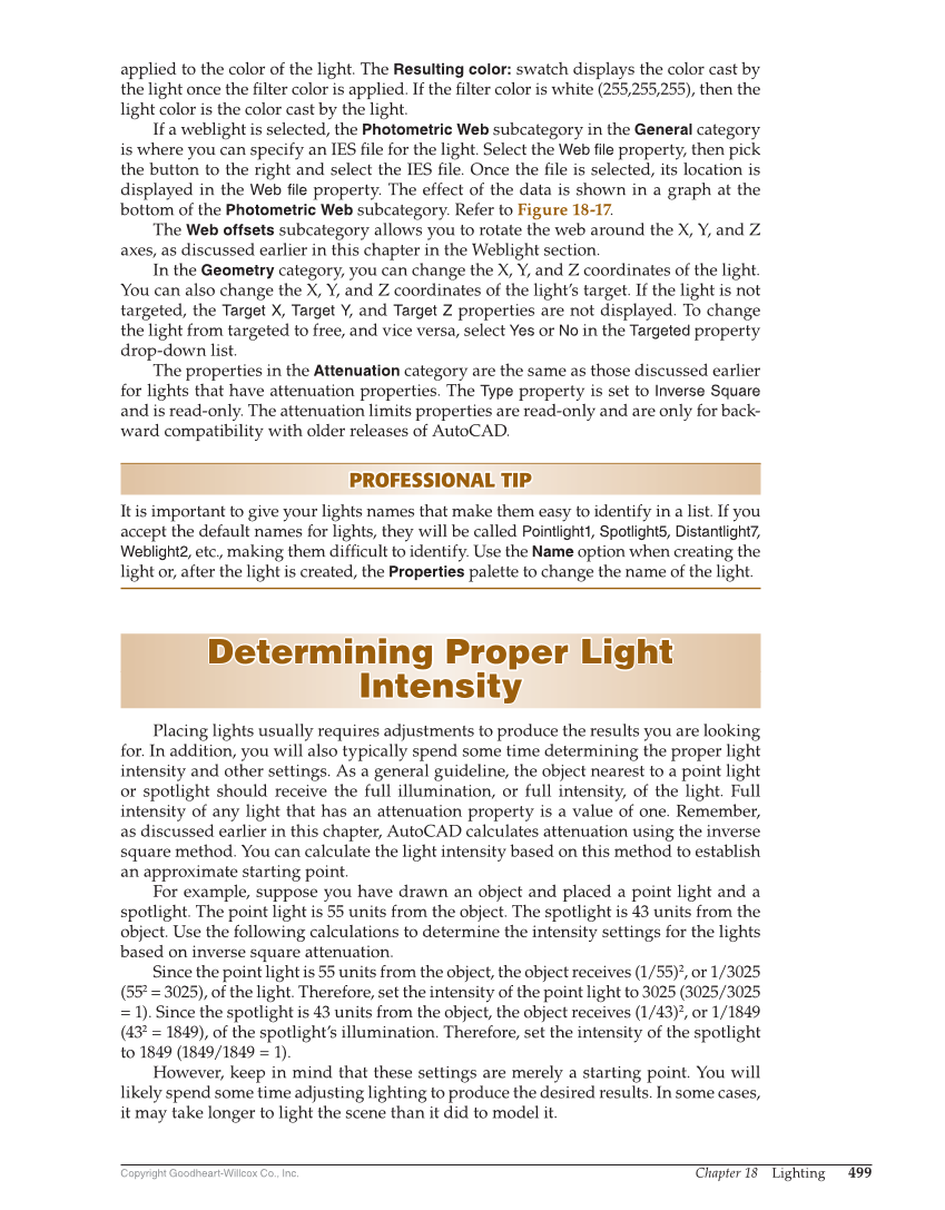 Copyright Goodheart-Willcox Co., Inc. Chapter 18 Lighting 499 applied to the color of the light. The Resulting color: swatch displays the color cast by the light once the fi lter color is applied. If the fi lter color is white (255,255,255), then the light color is the color cast by the light. If a weblight is selected, the Photometric Web subcategory in the General category is where you can specify an IES fi le for the light. Select the Web file property, then pick the button to the right and select the IES fi le. Once the fi le is selected, its location is displayed in the Web file property. The effect of the data is shown in a graph at the bottom of the Photometric Web subcategory. Refer to Figure 18-17. The Web offsets subcategory allows you to rotate the web around the X, Y, and Z axes, as discussed earlier in this chapter in the Weblight section. In the Geometry category, you can change the X, Y, and Z coordinates of the light. You can also change the X, Y, and Z coordinates of the light’s target. If the light is not targeted, the Target X, Target Y, and Target Z properties are not displayed. To change the light from targeted to free, and vice versa, select Yes or No in the Targeted property drop-down list. The properties in the Attenuation category are the same as those discussed earlier for lights that have attenuation properties. The Type property is set to Inverse Square and is read-only. The attenuation limits properties are read-only and are only for back- ward compatibility with older releases of AutoCAD. PROFESSIONAL TIP PROFESSIONAL TIP It is important to give your lights names that make them easy to identify in a list. If you accept the default names for lights, they will be called Pointlight1, Spotlight5, Distantlight7, Weblight2, etc., making them diffi cult to identify. Use the Name option when creating the light or, after the light is created, the Properties palette to change the name of the light. Determining Proper Light Determining Proper Light Intensity Intensity Placing lights usually requires adjustments to produce the results you are looking for. In addition, you will also typically spend some time determining the proper light intensity and other settings. As a general guideline, the object nearest to a point light or spotlight should receive the full illumination, or full intensity, of the light. Full intensity of any light that has an attenuation property is a value of one. Remember, as discussed earlier in this chapter, AutoCAD calculates attenuation using the inverse square method. You can calculate the light intensity based on this method to establish an approximate starting point. For example, suppose you have drawn an object and placed a point light and a spotlight. The point light is 55 units from the object. The spotlight is 43 units from the object. Use the following calculations to determine the intensity settings for the lights based on inverse square attenuation. Since the point light is 55 units from the object, the object receives (1/55)2, or 1/3025 (552 = 3025), of the light. Therefore, set the intensity of the point light to 3025 (3025/3025 = 1). Since the spotlight is 43 units from the object, the object receives (1/43)2, or 1/1849 (432 = 1849), of the spotlight’s illumination. Therefore, set the intensity of the spotlight to 1849 (1849/1849 = 1). However, keep in mind that these settings are merely a starting point. You will likely spend some time adjusting lighting to produce the desired results. In some cases, it may take longer to light the scene than it did to model it.