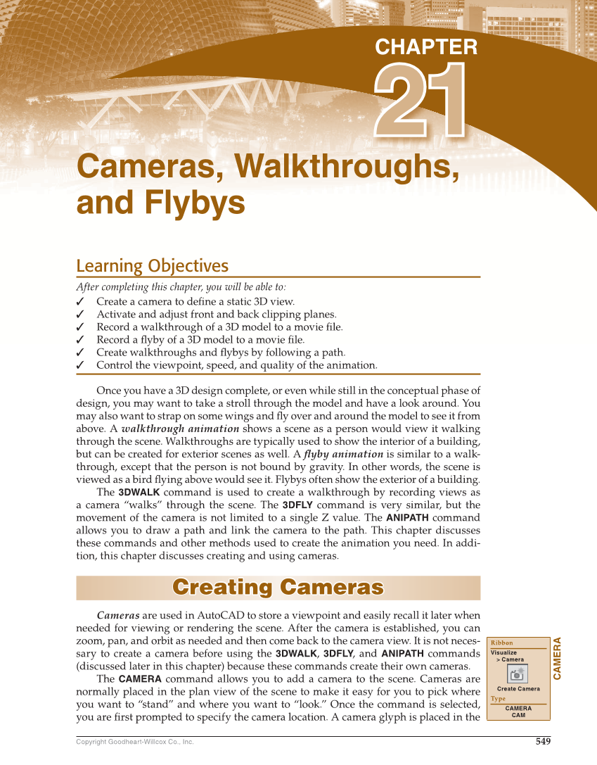 549 Copyright Goodheart-Willcox Co., Inc. Learning Objectives After completing this chapter, you will be able to: ✓ Create a camera to defi ne a static 3D view. ✓ Activate and adjust front and back clipping planes. ✓ Record a walkthrough of a 3D model to a movie fi le. ✓ Record a fl yby of a 3D model to a movie fi le. ✓ Create walkthroughs and fl ybys by following a path. ✓ Control the viewpoint, speed, and quality of the animation. Once you have a 3D design complete, or even while still in the conceptual phase of design, you may want to take a stroll through the model and have a look around. You may also want to strap on some wings and fl y over and around the model to see it from above. A walkthrough animation shows a scene as a person would view it walking through the scene. Walkthroughs are typically used to show the interior of a building, but can be created for exterior scenes as well. A fl yby animation is similar to a walk- through, except that the person is not bound by gravity. In other words, the scene is viewed as a bird fl ying above would see it. Flybys often show the exterior of a building. The 3DWALK command is used to create a walkthrough by recording views as a camera “walks” through the scene. The 3DFLY command is very similar, but the movement of the camera is not limited to a single Z value. The ANIPATH command allows you to draw a path and link the camera to the path. This chapter discusses these commands and other methods used to create the animation you need. In addi- tion, this chapter discusses creating and using cameras. Creating Cameras Creating Cameras Cameras are used in AutoCAD to store a viewpoint and easily recall it later when needed for viewing or rendering the scene. After the camera is established, you can zoom, pan, and orbit as needed and then come back to the camera view. It is not neces- sary to create a camera before using the 3DWALK, 3DFLY, and ANIPATH commands (discussed later in this chapter) because these commands create their own cameras. The CAMERA command allows you to add a camera to the scene. Cameras are normally placed in the plan view of the scene to make it easy for you to pick where you want to “stand” and where you want to “look.” Once the command is selected, you are fi rst prompted to specify the camera location. A camera glyph is placed in the CAMERA Ribbon Visualize Camera Create Camera Type CAMERA CAM Cameras, Walkthroughs, and Flybys 21CHAPTER 21