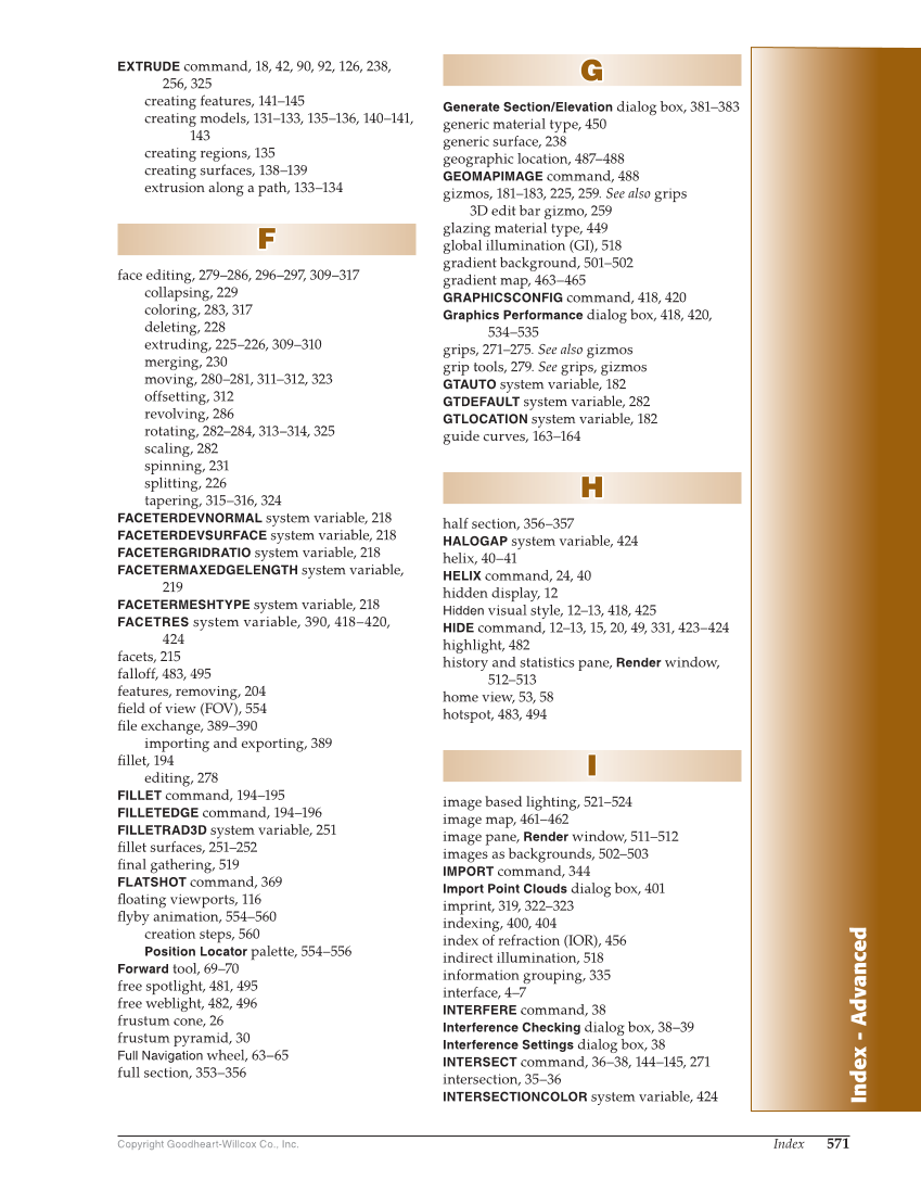 Index - Advanced Index 571 Copyright Goodheart-Willcox Co., Inc. EXTRUDE command, 18, 42, 90, 92, 126, 238, 256, 325 creating features, 141–145 creating models, 131–133, 135–136, 140–141, 143 creating regions, 135 creating surfaces, 138–139 extrusion along a path, 133–134 F F face editing, 279–286, 296–297, 309–317 collapsing, 229 coloring, 283, 317 deleting, 228 extruding, 225–226, 309–310 merging, 230 moving, 280–281, 311–312, 323 offsetting, 312 revolving, 286 rotating, 282–284, 313–314, 325 scaling, 282 spinning, 231 splitting, 226 tapering, 315–316, 324 FACETERDEVNORMAL system variable, 218 FACETERDEVSURFACE system variable, 218 FACETERGRIDRATIO system variable, 218 FACETERMAXEDGELENGTH system variable, 219 FACETERMESHTYPE system variable, 218 FACETRES system variable, 390, 418–420, 424 facets, 215 falloff, 483, 495 features, removing, 204 fi eld of view (FOV), 554 fi le exchange, 389–390 importing and exporting, 389 fi llet, 194 editing, 278 FILLET command, 194–195 FILLETEDGE command, 194–196 FILLETRAD3D system variable, 251 fi llet surfaces, 251–252 fi nal gathering, 519 FLATSHOT command, 369 fl oating viewports, 116 fl yby animation, 554–560 creation steps, 560 Position Locator palette, 554–556 Forward tool, 69–70 free spotlight, 481, 495 free weblight, 482, 496 frustum cone, 26 frustum pyramid, 30 Full Navigation wheel, 63–65 full section, 353–356 G G Generate Section/Elevation dialog box, 381–383 generic material type, 450 generic surface, 238 geographic location, 487–488 GEOMAPIMAGE command, 488 gizmos, 181–183, 225, 259. See also grips 3D edit bar gizmo, 259 glazing material type, 449 global illumination (GI), 518 gradient background, 501–502 gradient map, 463–465 GRAPHICSCONFIG command, 418, 420 Graphics Performance dialog box, 418, 420, 534–535 grips, 271–275. See also gizmos grip tools, 279. See grips, gizmos GTAUTO system variable, 182 GTDEFAULT system variable, 282 GTLOCATION system variable, 182 guide curves, 163–164 H H half section, 356–357 HALOGAP system variable, 424 helix, 40–41 HELIX command, 24, 40 hidden display, 12 Hidden visual style, 12–13, 418, 425 HIDE command, 12–13, 15, 20, 49, 331, 423–424 highlight, 482 history and statistics pane, Render window, 512–513 home view, 53, 58 hotspot, 483, 494 I I image based lighting, 521–524 image map, 461–462 image pane, Render window, 511–512 images as backgrounds, 502–503 IMPORT command, 344 Import Point Clouds dialog box, 401 imprint, 319, 322–323 indexing, 400, 404 index of refraction (IOR), 456 indirect illumination, 518 information grouping, 335 interface, 4–7 INTERFERE command, 38 Interference Checking dialog box, 38–39 Interference Settings dialog box, 38 INTERSECT command, 36 –38, 144–145, 271 intersection, 35–36 INTERSECTIONCOLOR system variable, 424