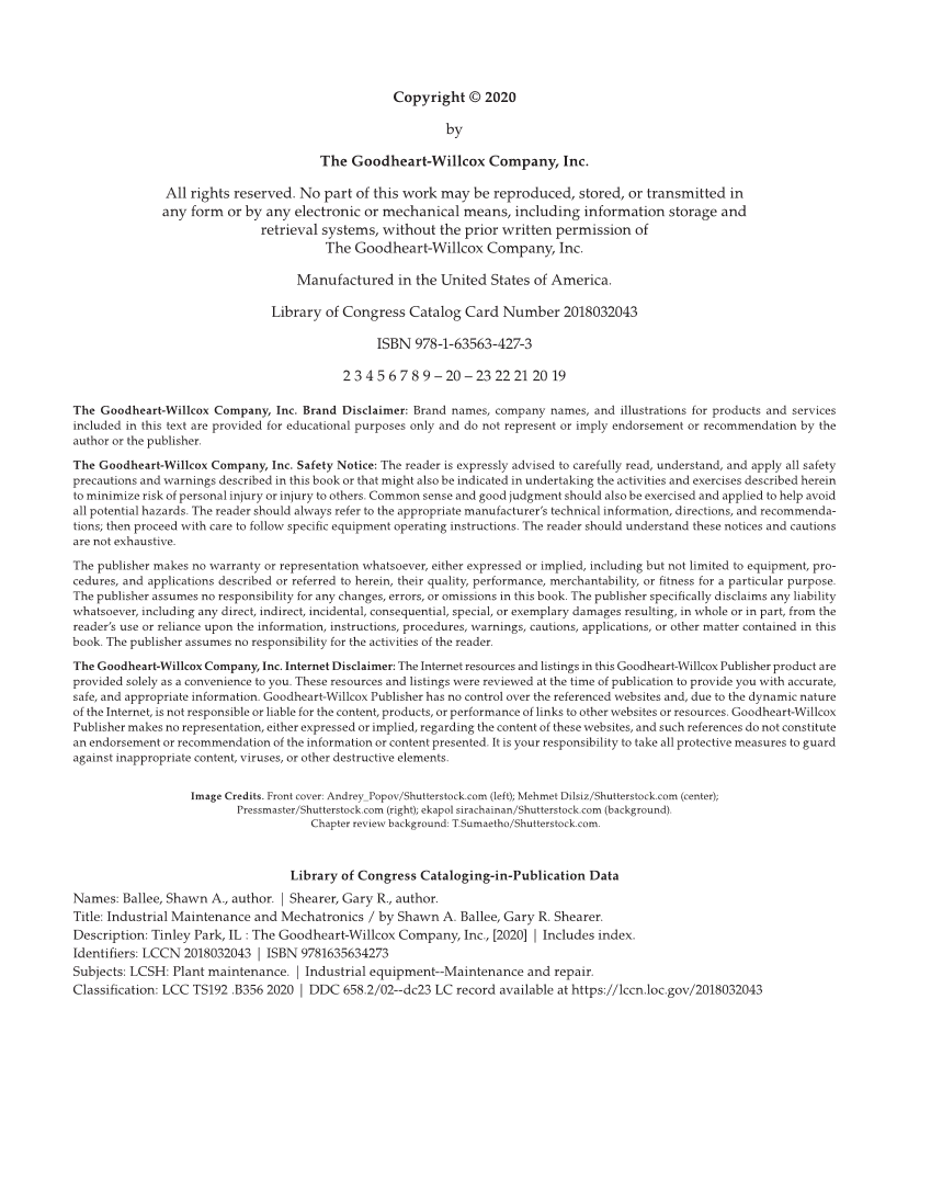 Copyright © 2020 by The Goodheart-Willcox Company, Inc. All rights reserved. No part of this work may be reproduced, stored, or transmitted in any form or by any electronic or mechanical means, including information storage and retrieval systems, without the prior written permission of The Goodheart-Willcox Company, Inc. Manufactured in the United States of America. Library of Congress Catalog Card Number 2018032043 ISBN 978-1-63563-427-3 2 3 4 5 6 7 8 9 – 20 – 23 22 21 20 19 The Goodheart-Willcox Company, Inc. Brand Disclaimer: Brand names, company names, and illustrations for products and services included in this text are provided for educational purposes only and do not represent or imply endorsement or recommendation by the author or the publisher. The Goodheart-Willcox Company, Inc. Safety Notice: The reader is expressly advised to carefully read, understand, and apply all safety precautions and warnings described in this book or that might also be indicated in undertaking the activities and exercises described herein to minimize risk of personal injury or injury to others. Common sense and good judgment should also be exercised and applied to help avoid all potential hazards. The reader should always refer to the appropriate manufacturer’s technical information, directions, and recommenda- tions then proceed with care to follow specifi c equipment operating instructions. The reader should understand these notices and cautions are not exhaustive. The publisher makes no warranty or representation whatsoever, either expressed or implied, including but not limited to equipment, pro- cedures, and applications described or referred to herein, their quality, performance, merchantability, or fi tness for a particular purpose. The publisher assumes no responsibility for any changes, errors, or omissions in this book. The publisher specifi cally disclaims any liability whatsoever, including any direct, indirect, incidental, consequential, special, or exemplary damages resulting, in whole or in part, from the reader’s use or reliance upon the information, instructions, procedures, warnings, cautions, applications, or other matter contained in this book. The publisher assumes no responsibility for the activities of the reader. The Goodheart-Willcox Company, Inc. Internet Disclaimer: The Internet resources and listings in this Goodheart-Willcox Publisher product are provided solely as a convenience to you. These resources and listings were reviewed at the time of publication to provide you with accurate, safe, and appropriate information. Goodheart-Willcox Publisher has no control over the referenced websites and, due to the dynamic nature of the Internet, is not responsible or liable for the content, products, or performance of links to other websites or resources. Goodheart-Willcox Publisher makes no representation, either expressed or implied, regarding the content of these websites, and such references do not constitute an endorsement or recommendation of the information or content presented. It is your responsibility to take all protective measures to guard against inappropriate content, viruses, or other destructive elements. Image Credits. Front cover: Andrey_Popov/Shutterstock.com (left) Mehmet Dilsiz/Shutterstock.com (center) Pressmaster/Shutterstock.com (right) ekapol sirachainan/Shutterstock.com (background). Chapter review background: T.Sumaetho/Shutterstock.com. Library of Congress Cataloging-in-Publication Data Names: Ballee, Shawn A., author. | Shearer, Gary R., author. Title: Industrial Maintenance and Mechatronics / by Shawn A. Ballee, Gary R. Shearer. Description: Tinley Park, IL : The Goodheart-Willcox Company, Inc., [2020] | Includes index. Identifi ers: LCCN 2018032043 | ISBN 9781635634273 Subjects: LCSH: Plant maintenance. | Industrial equipment--Maintenance and repair. Classifi cation: LCC TS192 .B356 2020 | DDC 658.2/02--dc23 LC record available at https://lccn.loc.gov/2018032043