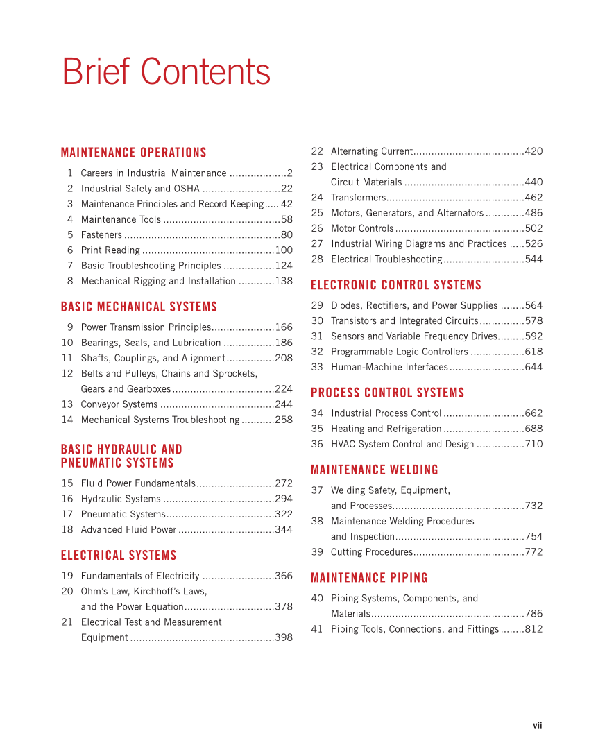 vii Brief Contents MAINTENANCE OPERATIONS 1 Careers in Industrial Maintenance ...................2 2 Industrial Safety and OSHA ..........................22 3 Maintenance Principles and Record Keeping ..... 42 4 Maintenance Tools .......................................58 5 Fasteners ....................................................80 6 Print Reading ............................................100 7 Basic Troubleshooting Principles .................124 8 Mechanical Rigging and Installation ............138 BASIC MECHANICAL SYSTEMS 9 Power Transmission Principles .....................166 10 Bearings, Seals, and Lubrication .................186 11 Shafts, Couplings, and Alignment ................208 12 Belts and Pulleys, Chains and Sprockets, Gears and Gearboxes ..................................224 13 Conveyor Systems ......................................244 14 Mechanical Systems Troubleshooting ...........258 BASIC HYDRAULIC AND PNEUMATIC SYSTEMS 15 Fluid Power Fundamentals ..........................272 16 Hydraulic Systems .....................................294 17 Pneumatic Systems ....................................322 18 Advanced Fluid Power ................................344 ELECTRICAL SYSTEMS 19 Fundamentals of Electricity ........................366 20 Ohm’s Law, Kirchhoff’s Laws, and the Power Equation ..............................378 21 Electrical Test and Measurement Equipment ................................................398 22 Alternating Current .....................................420 23 Electrical Components and Circuit Materials ........................................440 24 Transformers ..............................................462 25 Motors, Generators, and Alternators .............486 26 Motor Controls ...........................................502 27 Industrial Wiring Diagrams and Practices .....526 28 Electrical Troubleshooting ...........................544 ELECTRONIC CONTROL SYSTEMS 29 Diodes, Rectifi ers, and Power Supplies ........564 30 Transistors and Integrated Circuits ...............578 31 Sensors and Variable Frequency Drives .........592 32 Programmable Logic Controllers ..................618 33 Human-Machine Interfaces .........................644 PROCESS CONTROL SYSTEMS 34 Industrial Process Control ...........................662 35 Heating and Refrigeration ...........................688 36 HVAC System Control and Design ................710 MAINTENANCE WELDING 37 Welding Safety, Equipment, and Processes............................................732 38 Maintenance Welding Procedures and Inspection ...........................................754 39 Cutting Procedures .....................................772 MAINTENANCE PIPING 40 Piping Systems, Components, and Materials ...................................................786 41 Piping Tools, Connections, and Fittings ........812