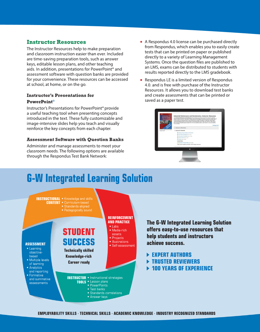 Instructor Resources The Instructor Resources help to make preparation and classroom instruction easier than ever. Included are time-saving preparation tools, such as answer keys, editable lesson plans, and other teaching aids. In addition, presentations for PowerPoint® and assessment software with question banks are provided for your convenience. These resources can be accessed at school, at home, or on the go. Instructor’s Presentations for PowerPoint® Instructor’s Presentations for PowerPoint® provide a useful teaching tool when presenting concepts introduced in the text. These fully customizable and image-intensive slides help you teach and visually reinforce the key concepts from each chapter. Assessment Software with Question Banks Administer and manage assessments to meet your classroom needs. The following options are available through the Respondus Test Bank Network: ■ A Respondus 4.0 license can be purchased directly from Respondus, which enables you to easily create tests that can be printed on paper or published directly to a variety of Learning Management Systems. Once the question fi les are published to an LMS, exams can be distributed to students with results reported directly to the LMS gradebook. ■ Respondus LE is a limited version of Respondus 4.0. and is free with purchase of the Instructor Resources. It allows you to download test banks and create assessments that can be printed or saved as a paper test. EMPLOYABILITY SKILLS ∙ TECHNICAL SKILLS ∙ ACADEMIC KNOWLEDGE ∙ INDUSTRY RECOGNIZED STANDARDS The G-W Integrated Learning Solution offers easy-to-use resources that help students and instructors achieve success. EXPERT AUTHORS TRUSTED REVIEWERS 100 YEARS OF EXPERIENCE G-W Integrated Learning Solution ASSESSMENT • Learning objective- based • Multiple levels of learning • Analytics and reporting • Formative and summative assessments • Knowledge and skills • Curriculum-based • Standards-aligned • Pedagogically sound INSTRUCTIONAL CONTENT INSTRUCTOR TOOLS • Instructional strategies • Lesson plans • PowerPoints • Test banks • Standards correlations • Answer keys REINFORCEMENT AND PRACTICE • Labs • Media-rich assets • Projects • Illustrations • Self-assessment STUDENT SUCCESS Technically skilled Knowledge-rich Career ready