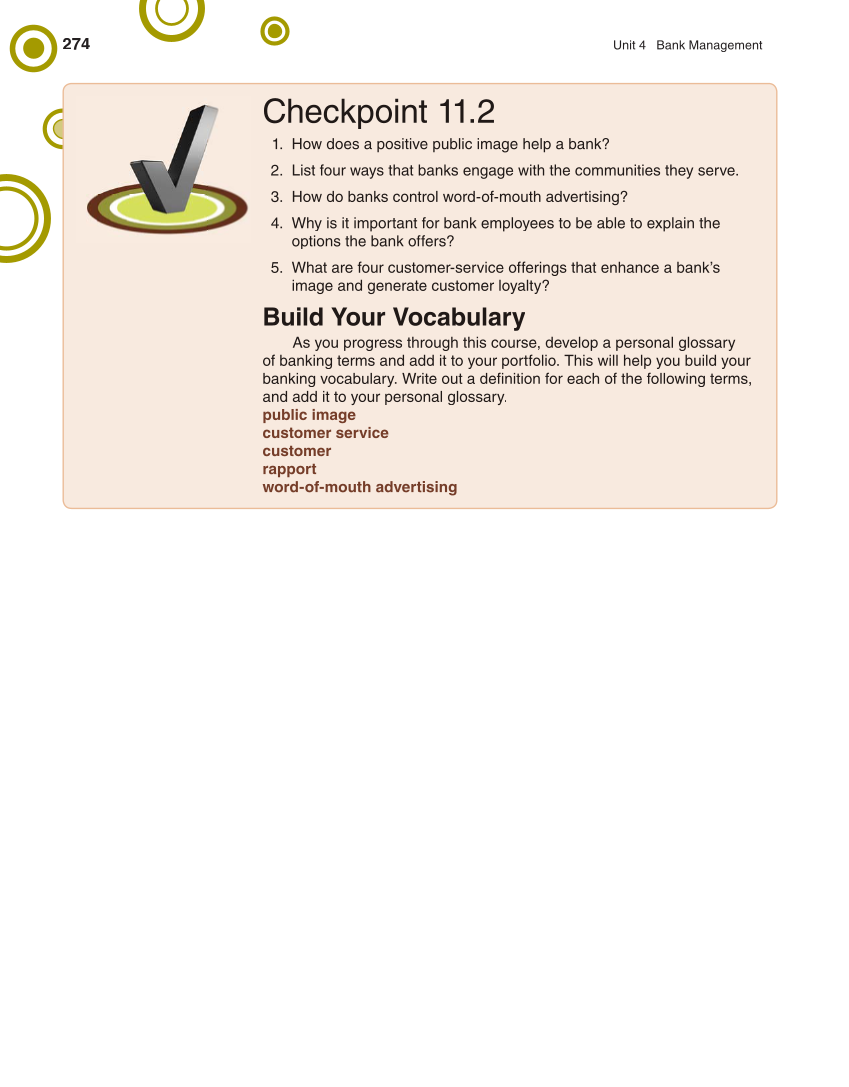 274 Unit 4 Bank Management Checkpoint 11.2 1. How does a positive public image help a bank? 2. List four ways that banks engage with the communities they serve. 3. How do banks control word-of-mouth advertising? 4. Why is it important for bank employees to be able to explain the options the bank offers? 5. What are four customer-service offerings that enhance a bank’s image and generate customer loyalty? Build Your Vocabulary As you progress through this course, develop a personal glossary of banking terms and add it to your portfolio. This will help you build your banking vocabulary. Write out a defi nition for each of the following terms, and add it to your personal glossary. public image customer service customer rapport word-of-mouth advertising