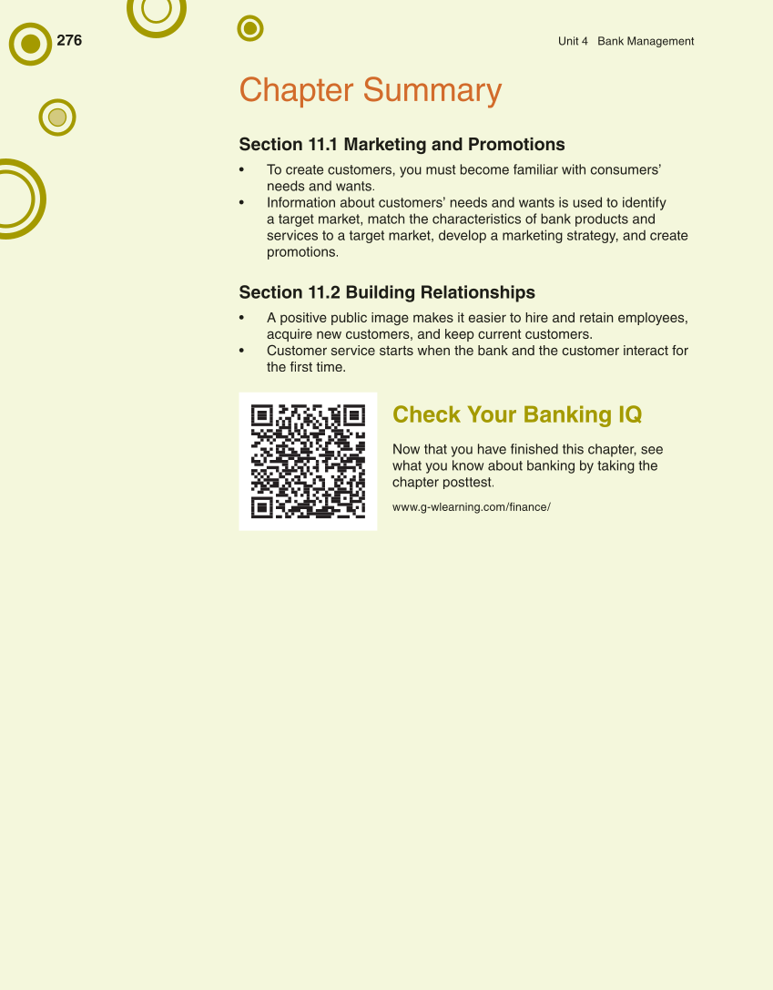 276 Unit 4 Bank Management Chapter Summary Section 11.1 Marketing and Promotions • To create customers, you must become familiar with consumers’ needs and wants. • Information about customers’ needs and wants is used to identify a target market, match the characteristics of bank products and services to a target market, develop a marketing strategy, and create promotions. Section 11.2 Building Relationships • A positive public image makes it easier to hire and retain employees, acquire new customers, and keep current customers. • Customer service starts when the bank and the customer interact for the fi rst time. fi Check Your Banking IQ Now that you have fi nished this chapter, see what you know about banking by taking the chapter posttest. www.g-wlearning.com/fi nance/