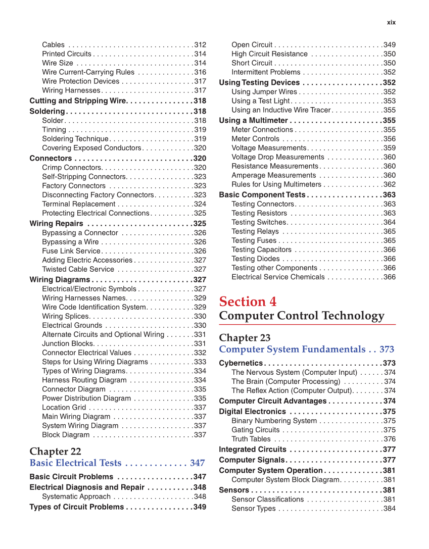 xix Cables . . . . . . . . . . . . . . . . . . . . . . . . . . . . . . .312 Printed Circuits . . . . . . . . . . . . . . . . . . . . . . . . .314 Wire Size . . . . . . . . . . . . . . . . . . . . . . . . . . . . .314 Wire Current-Carrying Rules . . . . . . . . . . . . . .316 Wire Protection Devices . . . . . . . . . . . . . . . . . .317 Wiring Harnesses. . . . . . . . . . . . . . . . . . . . . . .317 Cutting and Stripping Wire. . . . . . . . . . . . . . . .318 Soldering. . . . . . . . . . . . . . . . . . . . . . . . . . . . . .318 Solder. . . . . . . . . . . . . . . . . . . . . . . . . . . . . . . .318 Tinning . . . . . . . . . . . . . . . . . . . . . . . . . . . . . . .319 Soldering Technique. . . . . . . . . . . . . . . . . . . . .319 Covering Exposed Conductors. . . . . . . . . . . . .320 Connectors . . . . . . . . . . . . . . . . . . . . . . . . . . . .320 Crimp Connectors. . . . . . . . . . . . . . . . . . . . . . .320 Self-Stripping Connectors. . . . . . . . . . . . . . . . .323 Factory Connectors . . . . . . . . . . . . . . . . . . . . .323 Disconnecting Factory Connectors. . . . . . . . . .323 Terminal Replacement . . . . . . . . . . . . . . . . . . .324 Protecting Electrical Connections. . . . . . . . . . .325 Wiring Repairs . . . . . . . . . . . . . . . . . . . . . . . . .325 Bypassing a Connector . . . . . . . . . . . . . . . . . .326 Bypassing a Wire . . . . . . . . . . . . . . . . . . . . . . .326 Fuse Link Service. . . . . . . . . . . . . . . . . . . . . . .326 Adding Electric Accessories . . . . . . . . . . . . . . .327 Twisted Cable Service . . . . . . . . . . . . . . . . . . .327 Wiring Diagrams . . . . . . . . . . . . . . . . . . . . . . . .327 Electrical/Electronic Symbols . . . . . . . . . . . . . .327 Wiring Harnesses Names. . . . . . . . . . . . . . . . .329 Wire Code Identification System. . . . . . . . . . . .329 Wiring Splices. . . . . . . . . . . . . . . . . . . . . . . . . .330 Electrical Grounds . . . . . . . . . . . . . . . . . . . . . .330 Alternate Circuits and Optional Wiring . . . . . . .331 Junction Blocks. . . . . . . . . . . . . . . . . . . . . . . . .331 Connector Electrical Values . . . . . . . . . . . . . . .332 Steps for Using Wiring Diagrams . . . . . . . . . . .333 Types of Wiring Diagrams. . . . . . . . . . . . . . . . .334 Harness Routing Diagram . . . . . . . . . . . . . . . .334 Connector Diagram . . . . . . . . . . . . . . . . . . . . .335 Power Distribution Diagram . . . . . . . . . . . . . . .335 Location Grid . . . . . . . . . . . . . . . . . . . . . . . . . .337 Main Wiring Diagram . . . . . . . . . . . . . . . . . . . .337 System Wiring Diagram . . . . . . . . . . . . . . . . . .337 Block Diagram . . . . . . . . . . . . . . . . . . . . . . . . .337 Chapter 22 Basic Electrical Tests . . . . . . . . . . . . . 347 Basic Circuit Problems . . . . . . . . . . . . . . . . . .347 Electrical Diagnosis and Repair . . . . . . . . . . .348 Systematic Approach . . . . . . . . . . . . . . . . . . . .348 Types of Circuit Problems . . . . . . . . . . . . . . . .349 Open Circuit . . . . . . . . . . . . . . . . . . . . . . . . . . .349 High Circuit Resistance . . . . . . . . . . . . . . . . . .350 Short Circuit . . . . . . . . . . . . . . . . . . . . . . . . . . .350 Intermittent Problems . . . . . . . . . . . . . . . . . . . .352 Using Testing Devices . . . . . . . . . . . . . . . . . . .352 Using Jumper Wires . . . . . . . . . . . . . . . . . . . . .352 Using a Test Light. . . . . . . . . . . . . . . . . . . . . . .353 Using an Inductive Wire Tracer. . . . . . . . . . . . .355 Using a Multimeter . . . . . . . . . . . . . . . . . . . . . .355 Meter Connections . . . . . . . . . . . . . . . . . . . . . .355 Meter Controls . . . . . . . . . . . . . . . . . . . . . . . . .356 Voltage Measurements. . . . . . . . . . . . . . . . . . .359 Voltage Drop Measurements . . . . . . . . . . . . . .360 Resistance Measurements. . . . . . . . . . . . . . . .360 Amperage Measurements . . . . . . . . . . . . . . . .360 Rules for Using Multimeters . . . . . . . . . . . . . . .362 Basic Component Tests . . . . . . . . . . . . . . . . . .363 Testing Connectors. . . . . . . . . . . . . . . . . . . . . .363 Testing Resistors . . . . . . . . . . . . . . . . . . . . . . .363 Testing Switches. . . . . . . . . . . . . . . . . . . . . . . .364 Testing Relays . . . . . . . . . . . . . . . . . . . . . . . . .365 Testing Fuses . . . . . . . . . . . . . . . . . . . . . . . . . .365 Testing Capacitors . . . . . . . . . . . . . . . . . . . . . .366 Testing Diodes . . . . . . . . . . . . . . . . . . . . . . . . .366 Testing other Components . . . . . . . . . . . . . . . .366 Electrical Service Chemicals . . . . . . . . . . . . . .366 Section 4 Computer Control Technology Chapter 23 Computer System Fundamentals . . 373 Cybernetics. . . . . . . . . . . . . . . . . . . . . . . . . . . .373 The Nervous System (Computer Input) . . . . . . 374 The Brain (Computer Processing) . . . . . . . . . . 374 The Reflex Action (Computer Output). . . . . . . . 374 Computer Circuit Advantages . . . . . . . . . . . . . 374 Digital Electronics . . . . . . . . . . . . . . . . . . . . . .375 Binary Numbering System . . . . . . . . . . . . . . . .375 Gating Circuits . . . . . . . . . . . . . . . . . . . . . . . . .375 Truth Tables . . . . . . . . . . . . . . . . . . . . . . . . . . .376 Integrated Circuits . . . . . . . . . . . . . . . . . . . . . .377 Computer Signals. . . . . . . . . . . . . . . . . . . . . . .377 Computer System Operation. . . . . . . . . . . . . .381 Computer System Block Diagram. . . . . . . . . . .381 Sensors . . . . . . . . . . . . . . . . . . . . . . . . . . . . . . .381 Sensor Classifications . . . . . . . . . . . . . . . . . . .381 Sensor Types . . . . . . . . . . . . . . . . . . . . . . . . . .384