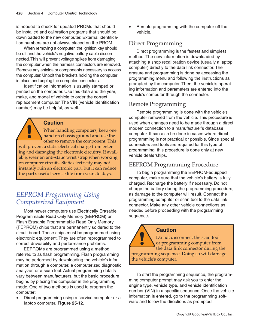 426 Section 4 Computer Control Technology Copyright Goodheart-Willcox Co., Inc. is needed to check for updated PROMs that should be installed and calibration programs that should be downloaded to the new computer. External identifica- tion numbers are not always placed on the PROM. When removing a computer, the ignition key should be off and the vehicle’s negative battery cable discon- nected. This will prevent voltage spikes from damaging the computer when the harness connectors are removed. Remove any shields or components necessary to access the computer. Unbolt the brackets holding the computer in place and unplug the computer connectors. Identification information is usually stamped or printed on the computer. Use this data and the year, make, and model of vehicle to order the correct replacement computer. The VIN (vehicle identification number) may be helpful, as well. Caution When handling computers, keep one hand on chassis ground and use the other to remove the component. This will prevent a static electrical charge from enter- ing and damaging the electronic circuitry. If avail- able, wear an anti-static wrist strap when working on computer circuits. Static electricity may not instantly ruin an electronic part, but it can reduce the part’s useful service life from years to days. EEPROM Programming Using Computerized Equipment Most newer computers use Electrically Erasable Programmable Read Only Memory (EEPROM) or Flash Erasable Programmable Read Only Memory (FEPROM) chips that are permanently soldered to the circuit board. These chips must be programmed using electronic equipment. They are often reprogrammed to correct driveability and performance problems. EEPROMs are programmed using a method referred to as flash programming. Flash programming may be performed by downloading the vehicle’s infor- mation through a computer, a computerized diagnostic analyzer, or a scan tool. Actual programming details vary between manufacturers, but the basic procedure begins by placing the computer in the programming mode. One of two methods is used to program the computer: • Direct programming using a service computer or a laptop computer, Figure 25-12. • Remote programming with the computer off the vehicle. Direct Programming Direct programming is the fastest and simplest method. The new information is downloaded by attaching a shop recalibration device (usually a laptop computer) directly to the data link connector. The erasure and programming is done by accessing the programming menu and following the instructions as prompted by the computer. Then, the vehicle’s operat- ing information and parameters are entered into the vehicle’s computer through the connector. Remote Programming Remote programming is done with the vehicle’s computer removed from the vehicle. This procedure is used when changes need to be made through a direct modem connection to a manufacturer’s database computer. It can also be done in cases where direct programming is not practical or possible. Since special connectors and tools are required for this type of programming, this procedure is done only at new vehicle dealerships. EEPROM Programming Procedure To begin programming the EEPROM-equipped computer, make sure that the vehicle’s battery is fully charged. Recharge the battery if necessary. Do not charge the battery during the programming procedure, as damage to the computer will result. Connect the programming computer or scan tool to the data link connector. Make any other vehicle connections as needed before proceeding with the programming sequence. Caution Do not disconnect the scan tool or programming computer from the data link connector during the programming sequence. Doing so will damage the vehicle’s computer. To start the programming sequence, the program- ming computer prompt may ask you to enter the engine type, vehicle type, and vehicle identification number (VIN) in a specific sequence. Once the vehicle information is entered, go to the programming soft- ware and follow the directions as prompted.