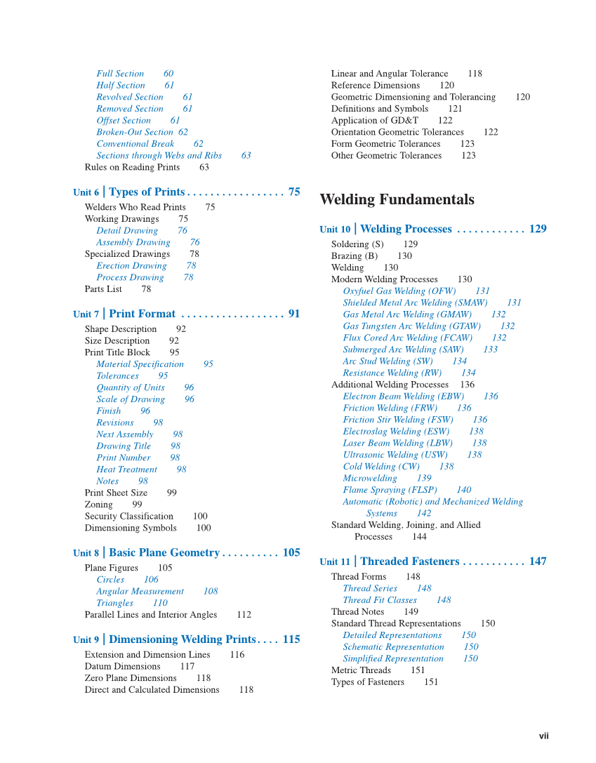 vii Full Section 60 Half Section 61 Revolved Section 61 Removed Section 61 Offset Section 61 Broken-Out Section 62 Conventional Break 62 Sections through Webs and Ribs 63 Rules on Reading Prints 63 Unit 6 | Types of Prints . . . . . . . . . . . . . . . . . 75 Welders Who Read Prints 75 Working Drawings 75 Detail Drawing 76 Assembly Drawing 76 Specialized Drawings 78 Erection Drawing 78 Process Drawing 78 Parts List 78 Unit 7 | Print Format . . . . . . . . . . . . . . . . . . 91 Shape Description 92 Size Description 92 Print Title Block 95 Material Specification 95 Tolerances 95 Quantity of Units 96 Scale of Drawing 96 Finish 96 Revisions 98 Next Assembly 98 Drawing Title 98 Print Number 98 Heat Treatment 98 Notes 98 Print Sheet Size 99 Zoning 99 Security Classification 100 Dimensioning Symbols 100 Unit 8 | Basic Plane Geometry . . . . . . . . . . 105 Plane Figures 105 Circles 106 Angular Measurement 108 Triangles 110 Parallel Lines and Interior Angles 112 Unit 9 | Dimensioning Welding Prints. . . . 115 Extension and Dimension Lines 116 Datum Dimensions 117 Zero Plane Dimensions 118 Direct and Calculated Dimensions 118 Linear and Angular Tolerance 118 Reference Dimensions 120 Geometric Dimensioning and Tolerancing 120 Definitions and Symbols 121 Application of GD&T 122 Orientation Geometric Tolerances 122 Form Geometric Tolerances 123 Other Geometric Tolerances 123 Welding Fundamentals Unit 10 | Welding Processes . . . . . . . . . . . . 129 Soldering (S) 129 Brazing (B) 130 Welding 130 Modern Welding Processes 130 Oxyfuel Gas Welding (OFW) 131 Shielded Metal Arc Welding (SMAW) 131 Gas Metal Arc Welding (GMAW) 132 Gas Tungsten Arc Welding (GTAW) 132 Flux Cored Arc Welding (FCAW) 132 Submerged Arc Welding (SAW) 133 Arc Stud Welding (SW) 134 Resistance Welding (RW) 134 Additional Welding Processes 136 Electron Beam Welding (EBW) 136 Friction Welding (FRW) 136 Friction Stir Welding (FSW) 136 Electroslag Welding (ESW) 138 Laser Beam Welding (LBW) 138 Ultrasonic Welding (USW) 138 Cold Welding (CW) 138 Microwelding 139 Flame Spraying (FLSP) 140 Automatic (Robotic) and Mechanized Welding Systems 142 Standard Welding, Joining, and Allied Processes 144 Unit 11 | Threaded Fasteners . . . . . . . . . . . 147 Thread Forms 148 Thread Series 148 Thread Fit Classes 148 Thread Notes 149 Standard Thread Representations 150 Detailed Representations 150 Schematic Representation 150 Simplified Representation 150 Metric Threads 151 Types of Fasteners 151