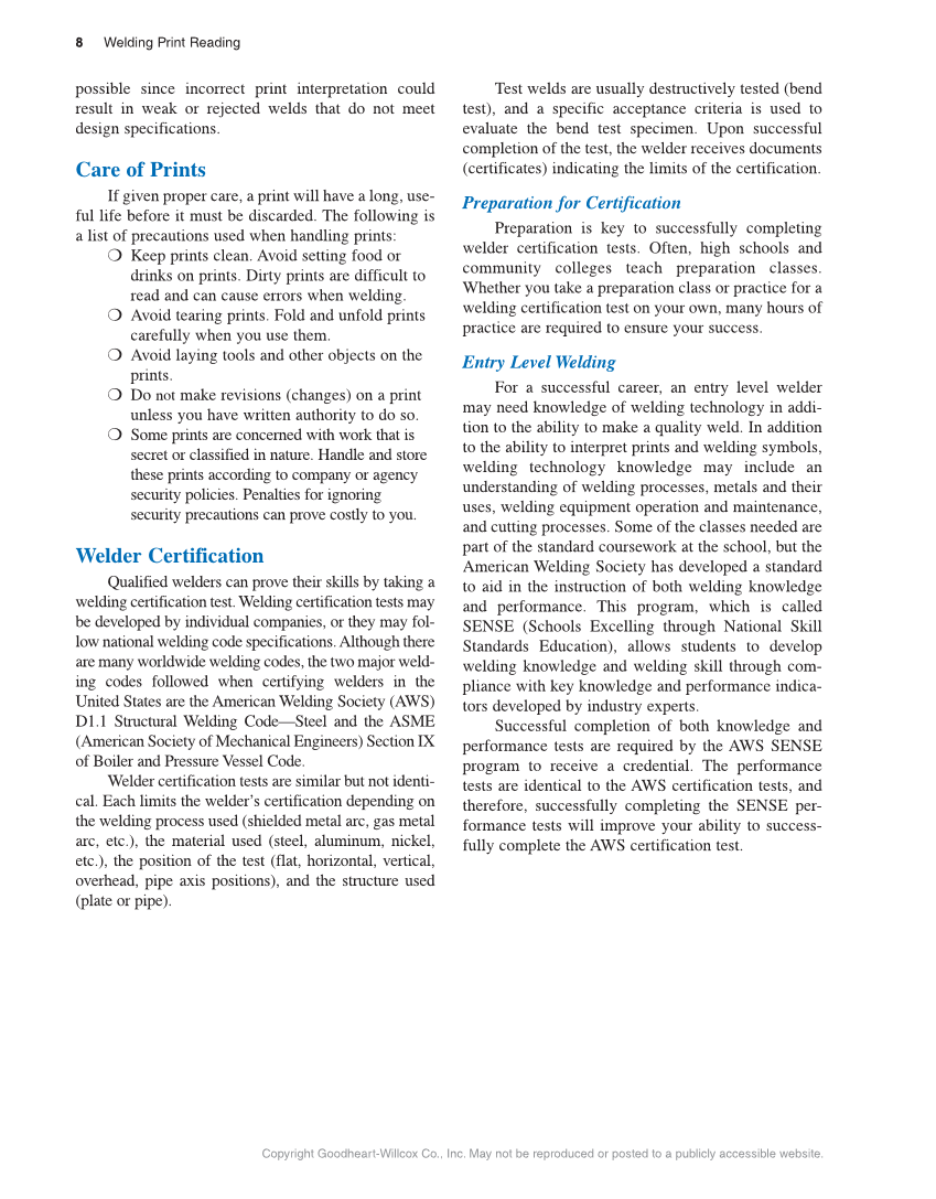 8 Welding Print Reading Copyright Goodheart-Willcox Co., Inc. May not be reproduced or posted to a publicly accessible website. possible since incorrect print interpretation could result in weak or rejected welds that do not meet design specifications. Care of Prints If given proper care, a print will have a long, use- ful life before it must be discarded. The following is a list of precautions used when handling prints: ❍ Keep prints clean. Avoid setting food or drinks on prints. Dirty prints are difficult to read and can cause errors when welding. ❍ Avoid tearing prints. Fold and unfold prints carefully when you use them. ❍ Avoid laying tools and other objects on the prints. ❍ Do not make revisions (changes) on a print unless you have written authority to do so. ❍ Some prints are concerned with work that is secret or classified in nature. Handle and store these prints according to company or agency security policies. Penalties for ignoring security precautions can prove costly to you. Welder Certification Qualified welders can prove their skills by taking a welding certification test. Welding certification tests may be developed by individual companies, or they may fol- low national welding code specifications. Although there are many worldwide welding codes, the two major weld- ing codes followed when certifying welders in the United States are the American Welding Society (AWS) D1.1 Structural Welding Code—Steel and the ASME (American Society of Mechanical Engineers) Section IX of Boiler and Pressure Vessel Code. Welder certification tests are similar but not identi- cal. Each limits the welder’s certification depending on the welding process used (shielded metal arc, gas metal arc, etc.), the material used (steel, aluminum, nickel, etc.), the position of the test (flat, horizontal, vertical, overhead, pipe axis positions), and the structure used (plate or pipe). Test welds are usually destructively tested (bend test), and a specific acceptance criteria is used to evaluate the bend test specimen. Upon successful completion of the test, the welder receives documents (certificates) indicating the limits of the certification. Preparation for Certification Preparation is key to successfully completing welder certification tests. Often, high schools and community colleges teach preparation classes. Whether you take a preparation class or practice for a welding certification test on your own, many hours of practice are required to ensure your success. Entry Level Welding For a successful career, an entry level welder may need knowledge of welding technology in addi- tion to the ability to make a quality weld. In addition to the ability to interpret prints and welding symbols, welding technology knowledge may include an understanding of welding processes, metals and their uses, welding equipment operation and maintenance, and cutting processes. Some of the classes needed are part of the standard coursework at the school, but the American Welding Society has developed a standard to aid in the instruction of both welding knowledge and performance. This program, which is called SENSE (Schools Excelling through National Skill Standards Education), allows students to develop welding knowledge and welding skill through com- pliance with key knowledge and performance indica- tors developed by industry experts. Successful completion of both knowledge and performance tests are required by the AWS SENSE program to receive a credential. The performance tests are identical to the AWS certification tests, and therefore, successfully completing the SENSE per- formance tests will improve your ability to success- fully complete the AWS certification test.