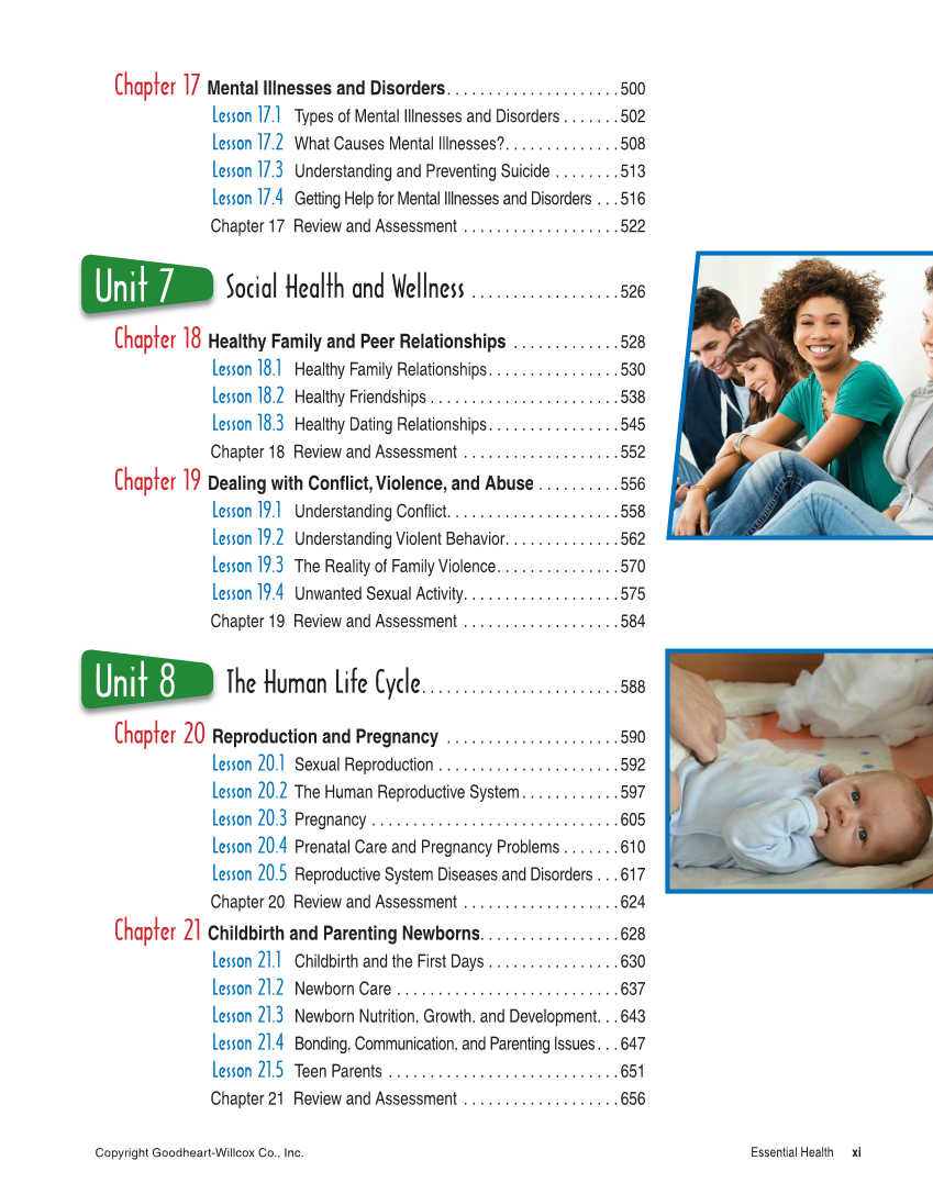 Copyright Goodheart-Willcox Co., Inc. Essential Health xi Chapter 17 Mental Illnesses and Disorders. . . . . . . . . . . . . . . . . . . . . 500 Lesson 17.1 Types of Mental Illnesses and Disorders . . . . . . . 502 Lesson 17.2 What Causes Mental Illnesses? . . . . . . . . . . . . . . 508 Lesson 17.3 Understanding and Preventing Suicide . . . . . . . . 513 Lesson 17.4 Getting Help for Mental Illnesses and Disorders . . . 516 Chapter 17 Review and Assessment . . . . . . . . . . . . . . . . . . . 522 Social Health and Wellness . . . . . . . . . . . . . . . . . . 526 Chapter 18 Healthy Family and Peer Relationships . . . . . . . . . . . . . 528 Lesson 18.1 Healthy Family Relationships . . . . . . . . . . . . . . . . 530 Lesson 18.2 Healthy Friendships . . . . . . . . . . . . . . . . . . . . . . . 538 Lesson 18.3 Healthy Dating Relationships . . . . . . . . . . . . . . . . 545 Chapter 18 Review and Assessment . . . . . . . . . . . . . . . . . . . 552 Chapter 19 Dealing with Conflict, Violence, and Abuse fl . . . . . . . . . . 556 Lesson 19.1 Understanding Confl ict . . . . . . . . . . . . . . . . . . . . . 558 Lesson 19.2 Understanding Violent Behavior . . . . . . . . . . . . . . 562 Lesson 19.3 The Reality of Family Violence . . . . . . . . . . . . . . . 570 Lesson 19.4 Unwanted Sexual Activity . . . . . . . . . . . . . . . . . . . 575 Chapter 19 Review and Assessment . . . . . . . . . . . . . . . . . . . 584 The Human Life Cycle. . . . . . . . . . . . . . . . . . . . . . . . 588 Chapter 20 Reproduction and Pregnancy . . . . . . . . . . . . . . . . . . . . . 590 Lesson 20.1 Sexual Reproduction . . . . . . . . . . . . . . . . . . . . . . 592 Lesson 20.2 The Human Reproductive System . . . . . . . . . . . . 597 Lesson 20.3 Pregnancy . . . . . . . . . . . . . . . . . . . . . . . . . . . . . . 605 Lesson 20.4 Prenatal Care and Pregnancy Problems . . . . . . . 610 Lesson 20.5 Reproductive System Diseases and Disorders . . . 617 Chapter 20 Review and Assessment . . . . . . . . . . . . . . . . . . . 624 Chapter 21 Childbirth and Parenting Newborns. . . . . . . . . . . . . . . . . 628 Lesson 21.1 Childbirth and the First Days . . . . . . . . . . . . . . . . 630 Lesson 21.2 Newborn Care . . . . . . . . . . . . . . . . . . . . . . . . . . . 637 Lesson 21.3 Newborn Nutrition, Growth, and Development . . . 643 Lesson 21.4 Bonding, Communication, and Parenting Issues . . . 647 Lesson 21.5 Teen Parents . . . . . . . . . . . . . . . . . . . . . . . . . . . . 651 Chapter 21 Review and Assessment . . . . . . . . . . . . . . . . . . . 656 Unit 7 Unit 8