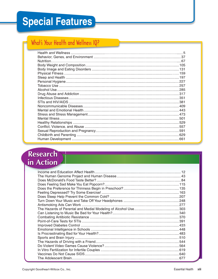 Copyright Goodheart-Willcox Co., Inc. Essential Health xiii Special Features What’s Your Health and Wellness IQ? Health and Wellness .................................................................................................................5 H l th d W ll Behavior, Genes, and Environment ........................................................................................37 Nutrition ...................................................................................................................................67 Body Weight and Composition ..............................................................................................105 Body Image and Eating Disorders ........................................................................................131 Physical Fitness ....................................................................................................................159 Sleep and Health ..................................................................................................................197 Personal Hygiene..................................................................................................................227 Tobacco Use .........................................................................................................................257 Alcohol Use...........................................................................................................................285 Drug Abuse and Addiction ....................................................................................................317 Infectious Diseases...............................................................................................................351 STIs and HIV/AIDS ...............................................................................................................381 Noncommunicable Diseases.................................................................................................409 Mental and Emotional Health ................................................................................................443 Stress and Stress Management ............................................................................................473 Mental Illness ........................................................................................................................501 Healthy Relationships Health y Relationships ...........................................................................................................529 52 9 Confl ict, Violence, and Abuse ...............................................................................................557 Sexual Reproduction and Pregnancy ....................................................................................591 Childbirth and Parenting .......................................................................................................629 Human Development ............................................................................................................661 I d Ed In come and Edu cation Affect Health .......................................................................................12 The Human Genome Project and Human Disease .................................................................43 Does McDonald’s Food Taste Better?.....................................................................................84 Does Feeling Sad Make You Eat Popcorn? ...........................................................................115 Does the Preference for Thinness Begin in Preschool? ........................................................135 Feeling Depressed? Try Some Exercise! ..............................................................................163 Does Sleep Help Prevent the Common Cold?......................................................................207 Turn Down Your Music and Take Off Your Headphones ........................................................248 Antismoking Ads Can Work ..................................................................................................277 The Hazards of Parental and Medial Modeling of Alcohol Use .............................................303 Can Listening to Music Be Bad for Your Health? ...................................................................340 Combating Antibiotic Resistance ..........................................................................................370 Point-of-Care Tests for STIs ..................................................................................................391 Improved Diabetes Control ...................................................................................................433 Emotional Intelligence in Schools .........................................................................................448 Is Procrastinating Bad for Your Health? .................................................................................483 Sports and Brain Injury .........................................................................................................510 The Hazards of Driving with a Friend ....................................................................................544 Do Violent Video Games Cause Violence? ...........................................................................564 In Vitro Fertilization for Infertile Couples ...............................................................................619 Vaccines Do Not Cause SIDS...............................................................................................640 The Adolescent Brain............................................................................................................677 I d Ed Research in Action