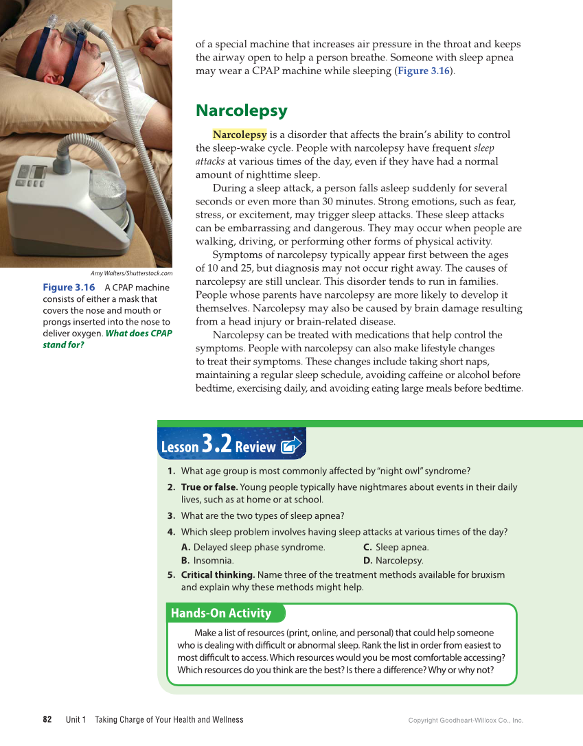 Unit 1 Taking Charge of Your Health and Wellness Copyright Goodheart-Willcox Co., Inc. 82 of a special machine that increases air pressure in the throat and keeps the airway open to help a person breathe. Someone with sleep apnea may wear a CPAP machine while sleeping (Figure 3.16). Narcolepsy Narcolepsy is a disorder that affects the brain’s ability to control the sleep-wake cycle. People with narcolepsy have frequent sleep attacks at various times of the day, even if they have had a normal amount of nighttime sleep. During a sleep attack, a person falls asleep suddenly for several seconds or even more than 30 minutes. Strong emotions, such as fear, stress, or excitement, may trigger sleep attacks. These sleep attacks can be embarrassing and dangerous. They may occur when people are walking, driving, or performing other forms of physical activity. Symptoms of narcolepsy typically appear first between the ages of 10 and 25, but diagnosis may not occur right away. The causes of narcolepsy are still unclear. This disorder tends to run in families. People whose parents have narcolepsy are more likely to develop it themselves. Narcolepsy may also be caused by brain damage resulting from a head injury or brain-related disease. Narcolepsy can be treated with medications that help control the symptoms. People with narcolepsy can also make lifestyle changes to treat their symptoms. These changes include taking short naps, maintaining a regular sleep schedule, avoiding caffeine or alcohol before bedtime, exercising daily, and avoiding eating large meals before bedtime. Lesson 3.2 Review 1. What age group is most commonly aff ected by “night owl” syndrome? 2. True or false. Young people typically have nightmares about events in their daily lives, such as at home or at school. 3. What are the two types of sleep apnea? 4. Which sleep problem involves having sleep attacks at various times of the day? A. Delayed sleep phase syndrome. B. Insomnia. C. Sleep apnea. D. Narcolepsy. 5. Critical thinking. Name three of the treatment methods available for bruxism and explain why these methods might help. Make a list of resources (print, online, and personal) that could help someone who is dealing with diffi cult or abnormal sleep. Rank the list in order from easiest to most diffi cult to access. Which resources would you be most comfortable accessing? Which resources do you think are the best? Is there a diff erence? Why or why not? Hands-On Activity Hands-On Activity Amy Walters/Shutterstock.com Figure 3.16 A CPAP machine consists of either a mask that covers the nose and mouth or prongs inserted into the nose to deliver oxygen. What does CPAP stand for?
