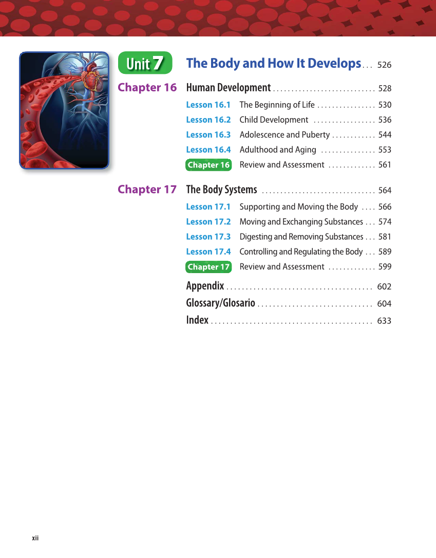 xii Unit 7 The Body and How It Develops . . . 526 Chapter 16 Human Development . . . . . . . . . . . . . . . . . . . . . . . . . . . . 528 Lesson 16.1 The Beginning of Life . . . . . . . . . . . . . . . . 530 Lesson 16.2 Child Development . . . . . . . . . . . . . . . . . 536 Lesson 16.3 Adolescence and Puberty . . . . . . . . . . . . 544 Lesson 16.4 Adulthood and Aging . . . . . . . . . . . . . . . 553 Chapter 16 Review and Assessment . . . . . . . . . . . . . 561 Chapter 17 The Body Systems . . . . . . . . . . . . . . . . . . . . . . . . . . . . . . . 564 Lesson 17.1 Supporting and Moving the Body . . . . 566 Lesson 17.2 Moving and Exchanging Substances . . . 574 Lesson 17.3 Digesting and Removing Substances . . . 581 Lesson 17.4 Controlling and Regulating the Body . . . 589 Chapter 17 Review and Assessment . . . . . . . . . . . . . 599 Appendix . . . . . . . . . . . . . . . . . . . . . . . . . . . . . . . . . . . . . . 602 Glossary/Glosario . . . . . . . . . . . . . . . . . . . . . . . . . . . . . . 604 Index . . . . . . . . . . . . . . . . . . . . . . . . . . . . . . . . . . . . . . . . . . 633
