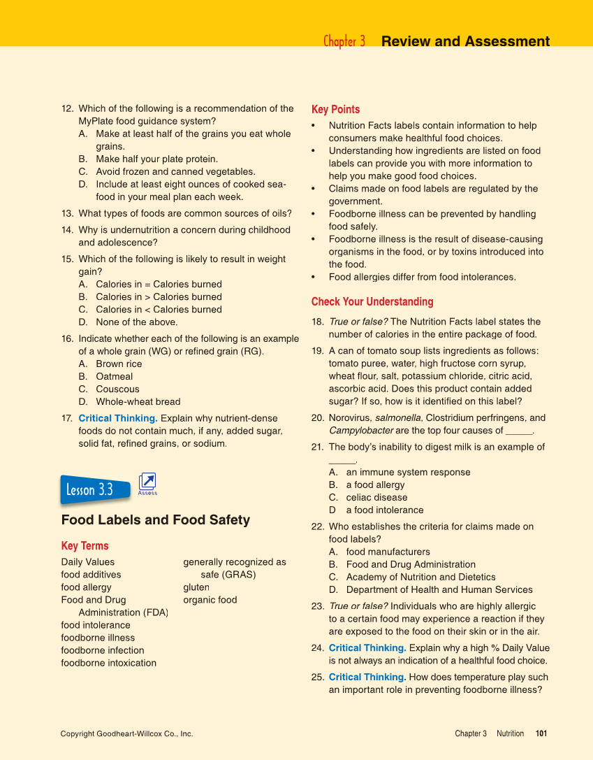 Copyright Goodheart-Willcox Co., Inc. Chapter 3 Nutrition 101 12. Which of the following is a recommendation of the MyPlate food guidance system? A. Make at least half of the grains you eat whole grains. B. Make half your plate protein. C. Avoid frozen and canned vegetables. D. Include at least eight ounces of cooked sea- food in your meal plan each week. 13. What types of foods are common sources of oils? 14. Why is undernutrition a concern during childhood and adolescence? 15. Which of the following is likely to result in weight gain? A. Calories in = Calories burned B. Calories in Calories burned C. Calories in Calories burned D. None of the above. 16. Indicate whether each of the following is an example of a whole grain (WG) or refi grain (RG). fined A. Brown rice B. Oatmeal C. Couscous D. Whole-wheat bread 17. Critical Thinking. Explain why nutrient-dense foods do not contain much, if any, added sugar, solid fat, refi ned grains, or sodium. Food Labels and Food Safety Key Terms Daily Values food additives food allergy Food and Drug Administration (FDA) food intolerance foodborne illness foodborne infection foodborne intoxication generally recognized as safe (GRAS) gluten organic food Chapter 3 e a Re e view a nd d Assess ssess me e nt t Lesson 3.3 Key Points • Nutrition Facts labels contain information to help consumers make healthful food choices. • Understanding how ingredients are listed on food labels can provide you with more information to help you make good food choices. • Claims made on food labels are regulated by the government. • Foodborne illness can be prevented by handling food safely. • Foodborne illness is the result of disease-causing organisms in the food, or by toxins introduced into the food. • Food allergies differ from food intolerances. Check Your Understanding 18. True or false? The Nutrition Facts label states the ? number of calories in the entire package of food. 19. A can of tomato soup lists ingredients as follows: tomato puree, water, high fructose corn syrup, wheat fl our, salt, potassium chloride, citric acid, ascorbic acid. Does this product contain added sugar? If so, how is it identified on this label? 20. Norovirus, salmonella, Clostridium perfringens, and Campylobacter are the top four causes of _____. r 21. The body’s inability to digest milk is an example of _____. A. an immune system response B. a food allergy C. celiac disease D a food intolerance 22. Who establishes the criteria for claims made on food labels? A. food manufacturers B. Food and Drug Administration C. Academy of Nutrition and Dietetics D. Department of Health and Human Services 23. True or false? Individuals who are highly allergic ? to a certain food may experience a reaction if they are exposed to the food on their skin or in the air. 24. Critical Thinking. Explain why a high % Daily Value is not always an indication of a healthful food choice. 25. Critical Thinking. How does temperature play such an important role in preventing foodborne illness? Assess
