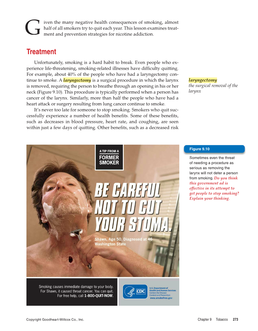 Copyright Goodheart-Willcox Co., Inc. Chapter 9 Tobacco 273 iven the many negative health consequences of smoking, almost half of all smokers try to quit each year. This lesson examines treat- ment and prevention strategies for nicotine addiction. Treatment Unfortunately, smoking is a hard habit to break. Even people who ex- perience life-threatening, smoking-related illnesses have diffi quitting. ficulty For example, about 40% of the people who have had a laryngectomy con- tinue to smoke. A lary y ng g ectomy y is a surgical procedure in which the larynx is removed, requiring the person to breathe through an opening in his or her neck (Figure 9.10). This procedure is typically performed when a person has cancer of the larynx. Similarly, more than half the people who have had a heart attack or surgery resulting from lung cancer continue to smoke. It’s never too late for someone to stop smoking. Smokers who quit suc- cessfully experience a number of health benefits. Some of these benefits,fi fi such as decreases in blood pressure, heart rate, and coughing, are seen within just a few days of quitting. Other benefits, such as a decreased risk fi G laryngectomy the surgical removal of the larynx Sometimes even the threat of needing a procedure as serious as removing the larynx will not deter a person from smoking. Do you think this government ad is effective in its attempt to get people to stop smoking? Explain your thinking. Figure 9.10