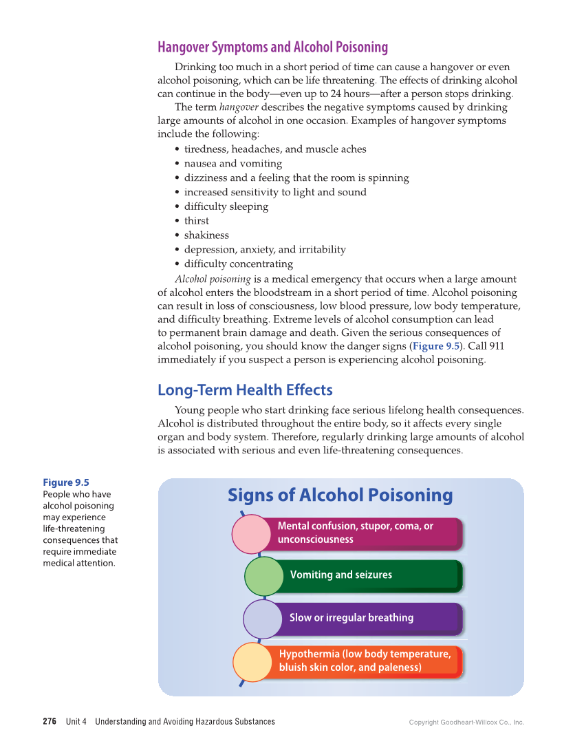 Unit 4 Understanding and Avoiding Hazardous Substances Copyright Goodheart-Willcox Co., Inc. 276 Hangover Symptoms and Alcohol Poisoning Drinking too much in a short period of time can cause a hangover or even alcohol poisoning, which can be life threatening. The effects of drinking alcohol can continue in the body—even up to 24 hours—after a person stops drinking. The term hangover describes the negative symptoms caused by drinking large amounts of alcohol in one occasion. Examples of hangover symptoms include the following: • tiredness, headaches, and muscle aches • nausea and vomiting • dizziness and a feeling that the room is spinning • increased sensitivity to light and sound • difficulty sleeping • thirst • shakiness • depression, anxiety, and irritability • difficulty concentrating Alcohol poisoning is a medical emergency that occurs when a large amount of alcohol enters the bloodstream in a short period of time. Alcohol poisoning can result in loss of consciousness, low blood pressure, low body temperature, and difficulty breathing. Extreme levels of alcohol consumption can lead to permanent brain damage and death. Given the serious consequences of alcohol poisoning, you should know the danger signs (Figure 9.5). Call 911 immediately if you suspect a person is experiencing alcohol poisoning. Long-Term Health Effects Young people who start drinking face serious lifelong health consequences. Alcohol is distributed throughout the entire body, so it affects every single organ and body system. Therefore, regularly drinking large amounts of alcohol is associated with serious and even life-threatening consequences. Signs of Alcohol Poisoning Slow or irregular breathing Hypothermia (low body temperature, bluish skin color, and paleness) Mental confusion, stupor, coma, or unconsciousness Vomiting and seizures Figure 9.5 People who have alcohol poisoning may experience life-threatening consequences that require immediate medical attention.