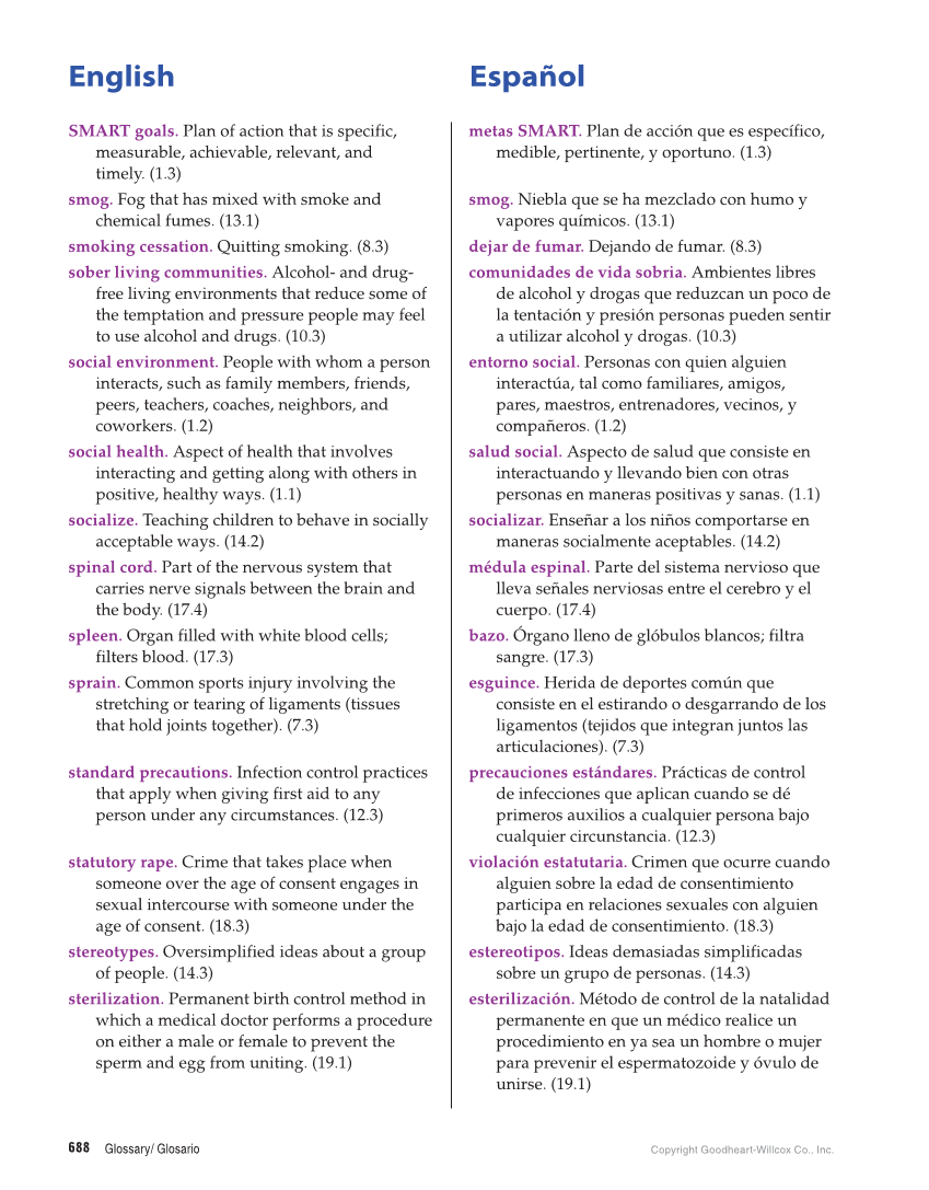 English Español Glossary/ Glosario Copyright Goodheart-Willcox Co., Inc. 688 SMART goals. Plan of action that is specific, measurable, achievable, relevant, and timely. (1.3) metas SMART. Plan de acción que es específico, medible, pertinente, y oportuno. (1.3) smog. Fog that has mixed with smoke and chemical fumes. (13.1) smog. Niebla que se ha mezclado con humo y vapores químicos. (13.1) smoking cessation. Quitting smoking. (8.3) dejar de fumar. Dejando de fumar. (8.3) sober living communities. Alcohol- and drug- free living environments that reduce some of the temptation and pressure people may feel to use alcohol and drugs. (10.3) comunidades de vida sobria. Ambientes libres de alcohol y drogas que reduzcan un poco de la tentación y presión personas pueden sentir a utilizar alcohol y drogas. (10.3) social environment. People with whom a person interacts, such as family members, friends, peers, teachers, coaches, neighbors, and coworkers. (1.2) entorno social. Personas con quien alguien interactúa, tal como familiares, amigos, pares, maestros, entrenadores, vecinos, y compañeros. (1.2) social health. Aspect of health that involves interacting and getting along with others in positive, healthy ways. (1.1) salud social. Aspecto de salud que consiste en interactuando y llevando bien con otras personas en maneras positivas y sanas. (1.1) socialize. Teaching children to behave in socially acceptable ways. (14.2) socializar. Enseñar a los niños comportarse en maneras socialmente aceptables. (14.2) spinal cord. Part of the nervous system that carries nerve signals between the brain and the body. (17.4) médula espinal. Parte del sistema nervioso que lleva señales nerviosas entre el cerebro y el cuerpo. (17.4) spleen. Organ filled with white blood cells filters blood. (17.3) bazo. Órgano lleno de glóbulos blancos filtra sangre. (17.3) sprain. Common sports injury involving the stretching or tearing of ligaments (tissues that hold joints together). (7.3) esguince. Herida de deportes común que consiste en el estirando o desgarrando de los ligamentos (tejidos que integran juntos las articulaciones). (7.3) standard precautions. Infection control practices that apply when giving first aid to any person under any circumstances. (12.3) precauciones estándares. Prácticas de control de infecciones que aplican cuando se dé primeros auxilios a cualquier persona bajo cualquier circunstancia. (12.3) statutory rape. Crime that takes place when someone over the age of consent engages in sexual intercourse with someone under the age of consent. (18.3) violación estatutaria. Crimen que ocurre cuando alguien sobre la edad de consentimiento participa en relaciones sexuales con alguien bajo la edad de consentimiento. (18.3) stereotypes. Oversimplified ideas about a group of people. (14.3) estereotipos. Ideas demasiadas simplificadas sobre un grupo de personas. (14.3) sterilization. Permanent birth control method in which a medical doctor performs a procedure on either a male or female to prevent the sperm and egg from uniting. (19.1) esterilización. Método de control de la natalidad permanente en que un médico realice un procedimiento en ya sea un hombre o mujer para prevenir el espermatozoide y óvulo de unirse. (19.1)