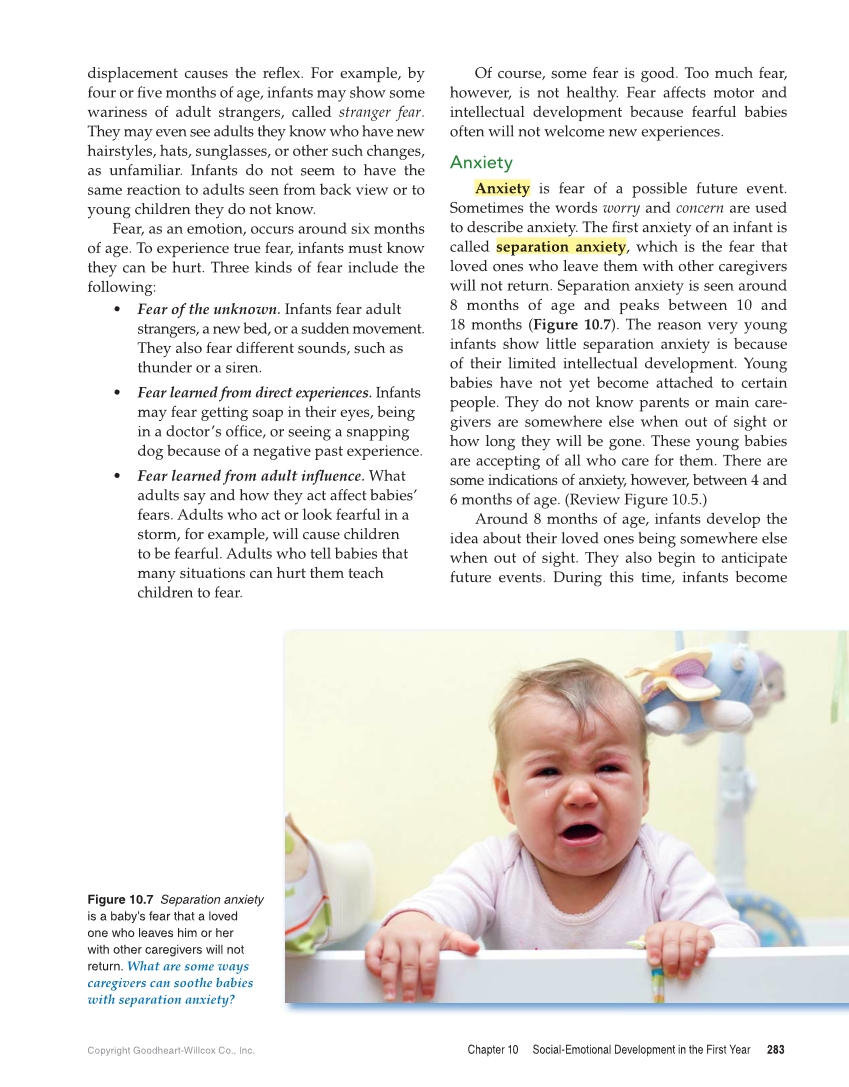 Copyright Goodheart-Willcox Co., Inc. Chapter 10 Social-Emotional Development in the First Year 283 Of course, some fear is good. Too much fear, however, is not healthy. Fear affects motor and intellectual development because fearful babies often will not welcome new experiences. Anxiety Anxiety is fear of a possible future event. Sometimes the words worry and concern are used to describe anxiety. The fi rst anxiety of an infant is called separation anxiety, which is the fear that loved ones who leave them with other caregivers will not return. Separation anxiety is seen around 8 months of age and peaks between 10 and 18 months (Figure 10.7). The reason very young infants show little separation anxiety is because of their limited intellectual development. Young babies have not yet become attached to certain people. They do not know parents or main care- givers are somewhere else when out of sight or how long they will be gone. These young babies are accepting of all who care for them. There are some indications of anxiety, however, between 4 and 6 months of age. (Review Figure 10.5.) Around 8 months of age, infants develop the idea about their loved ones being somewhere else when out of sight. They also begin to anticipate future events. During this time, infants become displacement causes the refl ex. For example, by four or fi ve months of age, infants may show some wariness of adult strangers, called stranger fear. They may even see adults they know who have new hairstyles, hats, sunglasses, or other such changes, as unfamiliar. Infants do not seem to have the same reaction to adults seen from back view or to young children they do not know. Fear, as an emotion, occurs around six months of age. To experience true fear, infants must know they can be hurt. Three kinds of fear include the following: • Fear of the unknown. Infants fear adult strangers, a new bed, or a sudden movement. They also fear different sounds, such as thunder or a siren. • Fear learned from direct experiences. Infants may fear getting soap in their eyes, being in a doctor’s offi ce, or seeing a snapping dog because of a negative past experience. • Fear learned from adult infl uence. What adults say and how they act affect babies’ fears. Adults who act or look fearful in a storm, for example, will cause children to be fearful. Adults who tell babies that many situations can hurt them teach children to fear. Figure 10.7 Separation anxiety is a baby’s fear that a loved one who leaves him or her with other caregivers will not return. What are some ways caregivers can soothe babies with separation anxiety?