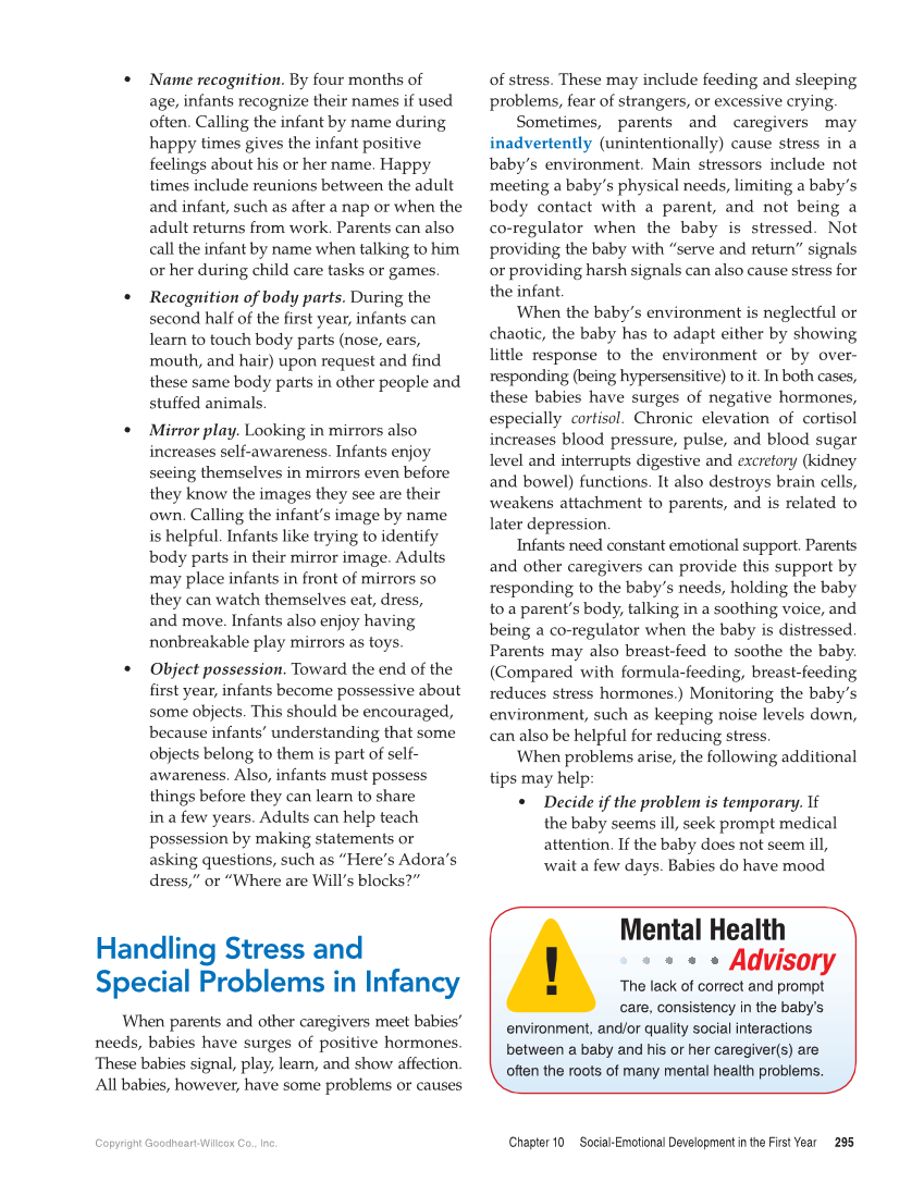Copyright Goodheart-Willcox Co., Inc. Chapter 10 Social-Emotional Development in the First Year 295 of stress. These may include feeding and sleeping problems, fear of strangers, or excessive crying. Sometimes, parents and caregivers may inadvertently (unintentionally) cause stress in a baby’s environment. Main stressors include not meeting a baby’s physical needs, limiting a baby’s body contact with a parent, and not being a co-regulator when the baby is stressed. Not providing the baby with “serve and return” signals or providing harsh signals can also cause stress for the infant. When the baby’s environment is neglectful or chaotic, the baby has to adapt either by showing little response to the environment or by over- responding (being hypersensitive) to it. In both cases, these babies have surges of negative hormones, especially cortisol. Chronic elevation of cortisol increases blood pressure, pulse, and blood sugar level and interrupts digestive and excretory (kidney and bowel) functions. It also destroys brain cells, weakens attachment to parents, and is related to later depression. Infants need constant emotional support. Parents and other caregivers can provide this support by responding to the baby’s needs, holding the baby to a parent’s body, talking in a soothing voice, and being a co-regulator when the baby is distressed. Parents may also breast-feed to soothe the baby. (Compared with formula-feeding, breast-feeding reduces stress hormones.) Monitoring the baby’s environment, such as keeping noise levels down, can also be helpful for reducing stress. When problems arise, the following additional tips may help: • Decide if the problem is temporary. If the baby seems ill, seek prompt medical attention. If the baby does not seem ill, wait a few days. Babies do have mood • Name recognition. By four months of age, infants recognize their names if used often. Calling the infant by name during happy times gives the infant positive feelings about his or her name. Happy times include reunions between the adult and infant, such as after a nap or when the adult returns from work. Parents can also call the infant by name when talking to him or her during child care tasks or games. • Recognition of body parts. During the second half of the fi rst year, infants can learn to touch body parts (nose, ears, mouth, and hair) upon request and fi nd these same body parts in other people and stuffed animals. • Mirror play. Looking in mirrors also increases self-awareness. Infants enjoy seeing themselves in mirrors even before they know the images they see are their own. Calling the infant’s image by name is helpful. Infants like trying to identify body parts in their mirror image. Adults may place infants in front of mirrors so they can watch themselves eat, dress, and move. Infants also enjoy having nonbreakable play mirrors as toys. • Object possession. Toward the end of the fi rst year, infants become possessive about some objects. This should be encouraged, because infants’ understanding that some objects belong to them is part of self- awareness. Also, infants must possess things before they can learn to share in a few years. Adults can help teach possession by making statements or asking questions, such as “Here’s Adora’s dress,” or “Where are Will’s blocks?” Handling Stress and Special Problems in Infancy When parents and other caregivers meet babies’ needs, babies have surges of positive hormones. These babies signal, play, learn, and show affection. All babies, however, have some problems or causes The lack of correct and prompt care, consistency in the baby’s environment, and/or quality social interactions between a baby and his or her caregiver(s) are often the roots of many mental health problems.