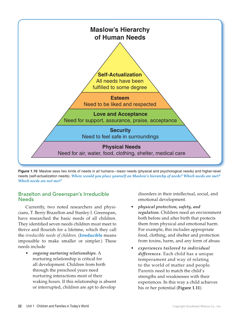 22 Unit 1 Children and Families in Today’s World Copyright Goodheart-Willcox Co., Inc. Brazelton and Greenspan’s Irreducible Needs Currently, two noted researchers and physi- cians, T. Berry Brazelton and Stanley I. Greenspan, have researched the basic needs of all children. They identifi ed seven needs children must meet to thrive and fl ourish for a lifetime, which they call the irreducible needs of children. (Irreducible means impossible to make smaller or simpler.) These needs include • ongoing nurturing relationships. A nurturing relationship is critical for all development. Children from birth through the preschool years need nurturing interactions most of their waking hours. If this relationship is absent or interrupted, children are apt to develop disorders in their intellectual, social, and emotional development. • physical protection, safety, and regulation. Children need an environment both before and after birth that protects them from physical and emotional harm. For example, this includes appropriate food, clothing, and shelter and protection from toxins, harm, and any form of abuse. • experiences tailored to individual differences. Each child has a unique temperament and way of relating to the world of matter and people. Parents need to match the child’s strengths and weaknesses with their experiences. In this way a child achieves his or her potential (Figure 1.11). Figure 1.10 Maslow sees two kinds of needs in all humans—basic needs (physical and psychological needs) and higher-level needs (self-actualization needs). Where would you place yourself on Maslow’s hierarchy of needs? Which needs are met? Which needs are not met? Maslow’s Hierarchy of Human Needs Self-Actualization All needs have been fulfilled to some degree Esteem Need to be liked and respected Love and Acceptance Need for support, assurance, praise, acceptance Security Need to feel safe in surroundings Physical Needs Need for air, water, food, clothing, shelter, medical care