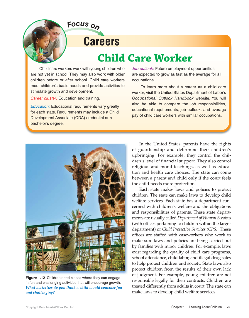 Copyright Goodheart-Willcox Co., Inc. Chapter 1 Learning About Children 25 In the United States, parents have the rights of guardianship and determine their children’s upbringing. For example, they control the chil- dren’s level of fi nancial support. They also control religious and moral teachings, as well as educa- tion and health care choices. The state can come between a parent and child only if the court feels the child needs more protection. Each state makes laws and policies to protect children. The state can make laws to develop child welfare services. Each state has a department con- cerned with children’s welfare and the obligations and responsibilities of parents. These state depart- ments are usually called Department of Human Services (with offi ces pertaining to children within the larger department) or Child Protective Services (CPS). These offi ces are staffed with caseworkers who work to make sure laws and policies are being carried out by families with minor children. For example, laws exist regarding the quality of child care programs, school attendance, child labor, and illegal drug sales to help protect children and society. State laws also protect children from the results of their own lack of judgment. For example, young children are not responsible legally for their contracts. Children are treated differently from adults in court. The state can make laws to develop child welfare services. Child Care Worker Child care workers work with young children who are not yet in school. They may also work with older children before or after school. Child care workers meet children’s basic needs and provide activities to stimulate growth and development. Career cluster: Education and training. Education: Educational requirements vary greatly for each state. Requirements may include a Child Development Associate (CDA) credential or a bachelor’s degree. Job outlook: Future employment opportunities are expected to grow as fast as the average for all occupations. To learn more about a career as a child care worker, visit the United States Department of Labor’s Occupational Outlook Handbook website. You will also be able to compare the job responsibilities, educational requirements, job outlook, and average pay of child care workers with similar occupations. Careers Figure 1.12 Children need places where they can engage in fun and challenging activities that will encourage growth. What activities do you think a child would consider fun and challenging?