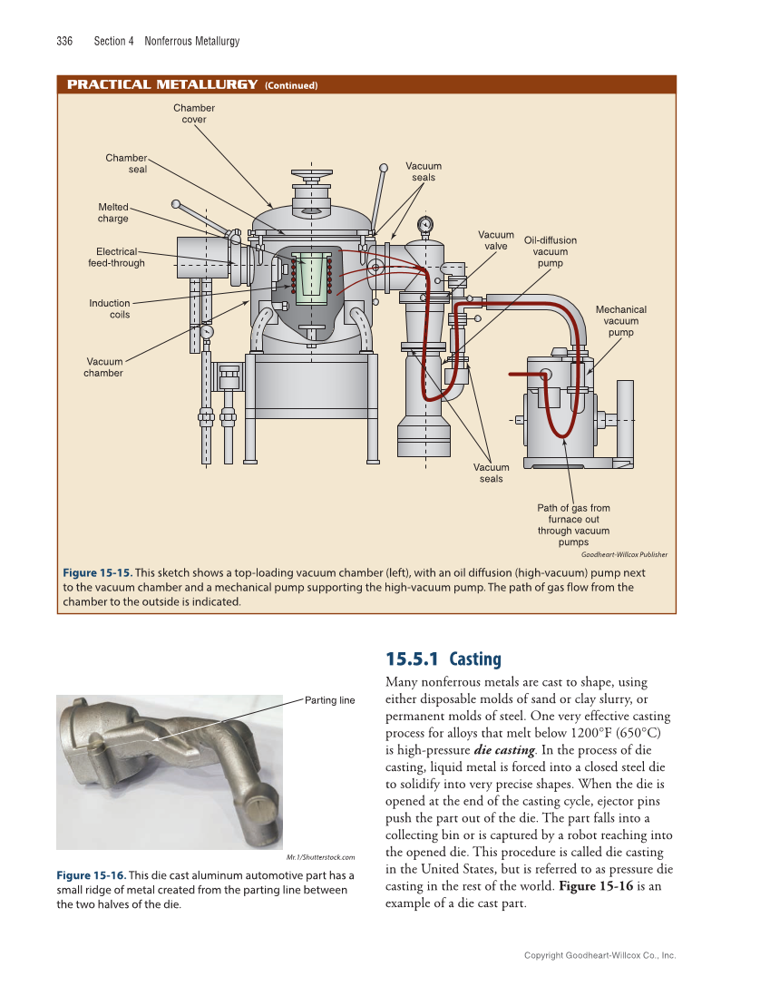 336 Section 4 Nonferrous Metallurgy 15.5.1 Casting Many nonferrous metals are cast to shape, using either disposable molds of s and or clay slurry, or permanent molds of steel. One very effective casting process for alloys that melt below 1200°F (650°C) is high-pressure die casting. In the process of die casting, liquid metal is forced into a closed steel die to solidify into very precise shapes. When the die is opened at the end of the casting cycle, ejector pins push the part out of the die. The part falls into a collecting bin or is captured by a robot reaching into the opened die. This procedure is called die casting in the United States, but is referred to as pressure die casting in the rest of the world. Figure 15-16 is an example of a die cast part. Mr.1/Shutterstock.com Figure 15-16. This die cast aluminum automotive part has a small ridge of metal created from the parting line between the two halves of the die. Parting line Vacuum valve Oil-diffusion vacuum pump Mechanical vacuum pump Path of gas from furnace out through vacuum pumps Vacuum seals Vacuum seals Chamber cover Chamber seal Melted charge Electrical feed-through Induction coils Vacuum chamber Goodheart-Willcox Publisher Figure 15-15. This sketch shows a top-loading vacuum chamber (left), with an oil diffusion (high-vacuum) pump next to the vacuum chamber and a mechanical pump supporting the high-vacuum pump. The path of gas flow from the chamber to the outside is indicated. PRACTICAL METALLURGY PRACTICAL METALLURGY (Continued) Copyright Goodheart-Willcox Co., Inc.