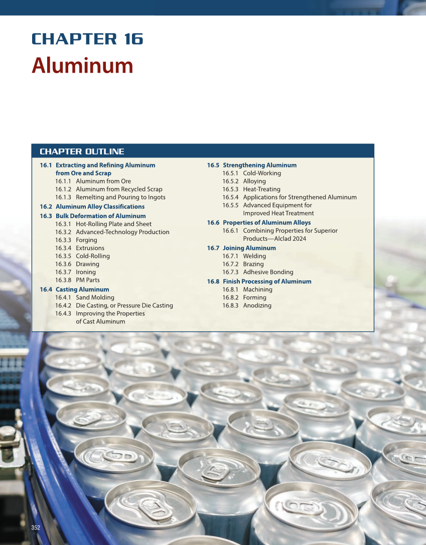 352 CHAPTER 16 Aluminum CHAPTER OUTLINE 16.1 Extracting and Refining Aluminum from Ore and Scrap 16.1.1 Aluminum from Ore 16.1.2 Aluminum from Recycled Scrap 16.1.3 Remelting and Pouring to Ingots 16.2 Aluminum Alloy Classifications 16.3 Bulk Deformation of Aluminum 16.3.1 Hot-Rolling Plate and Sheet 16.3.2 Advanced-Technology Production 16.3.3 Forging 16.3.4 Extrusions 16.3.5 Cold-Rolling 16.3.6 Drawing 16.3.7 Ironing 16.3.8 PM Parts 16.4 Casting Aluminum 16.4.1 Sand Molding 16.4.2 Die Casting, or Pressure Die Casting 16.4.3 Improving the Properties of Cast Aluminum 16.5 Strengthening Aluminum 16.5.1 Cold-Working 16.5.2 Alloying 16.5.3 Heat-Treating 16.5.4 Applications for Strengthened Aluminum 16.5.5 Advanced Equipment for Improved Heat Treatment 16.6 Properties of Aluminum Alloys 16.6.1 Combining Properties for Superior Products—Alclad 2024 16.7 Joining Aluminum 16.7.1 Welding 16.7.2 Brazing 16.7.3 Adhesive Bonding 16.8 Finish Processing of Aluminum 16.8.1 Machining 16.8.2 Forming 16.8.3 Anodizing