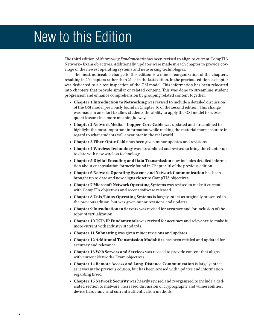 x Th e third edition of Networking Fundamentals has been revised to align to current CompTIA Network+ Exam objectives. Additionally, updates were made in each chapter to provide cov- erage of the newest operating systems and networking technologies. Th e most noticeable change to this edition is a minor reorganization of the chapters, resulting in 20 chapters rather than 21 as in the last edition. In the previous edition, a chapter was dedicated to a close inspection of the OSI model. Th is information has been relocated into chapters that provide similar or related content. Th is was done to streamline student progression and enhance comprehension by grouping related content together. ■ Chapter 1 Introduction to Networking was revised to include a detailed discussion of the OSI model previously found in Chapter 16 of the second edition. Th is change was made in an eff ort to allow students the ability to apply the OSI model to subse- quent lessons in a more meaningful way. ■ Chapter 2 Network Media—Copper-Core Cable was updated and streamlined to highlight the most important information while making the material more accurate in regard to what students will encounter in the real world. ■ Chapter 3 Fiber-Optic Cable has been given minor updates and revisions. ■ Chapter 4 Wireless Technology was streamlined and revised to bring the chapter up to date with new wireless technology. ■ Chapter 5 Digital Encoding and Data Transmission now includes detailed informa- tion about encapsulation formerly found in Chapter 16 of the previous edition. ■ Chapter 6 Network Operating Systems and Network Communication has been brought up to date and now aligns closer to CompTIA objectives. ■ Chapter 7 Microsoft Network Operating Systems was revised to make it current with CompTIA objectives and recent software released. ■ Chapter 8 Unix/Linux Operating Systems is largely intact as originally presented in the previous edition, but was given minor revisions and updates. ■ Chapter 9 Introduction to Servers was revised for accuracy and for inclusion of the topic of virtualization. ■ Chapter 10 TCP/IP Fundamentals was revised for accuracy and relevance to make it more current with industry standards. ■ Chapter 11 Subnetting was given minor revisions and updates. ■ Chapter 12 Additional Transmission Modalities has been retitled and updated for accuracy and relevance. ■ Chapter 13 Web Servers and Services was revised to provide content that aligns with current Network+ Exam objectives. ■ Chapter 14 Remote Access and Long-Distance Communication is largely intact as it was in the previous edition, but has been revised with updates and information regarding IPsec. ■ Chapter 15 Network Security was heavily revised and reorganized to include a ded- icated section to malware, increased discussion of cryptography and vulnerabilities, device hardening, and current authentication methods. New to this Edition