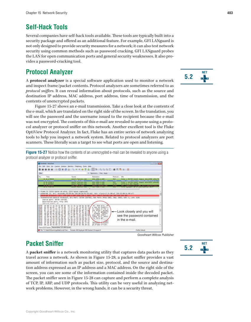 Copyright Goodheart-Willcox Co., Inc. 483 Chapter 15 Network Security Self-Hack Tools Several companies have self-hack tools available. Th ese tools are typically built into a security package and off ered as an additional feature. For example, GFI LANguard is not only designed to provide security measures for a network it can also test network security using common methods such as password cracking. GFI LANguard probes the LAN for open communication ports and general security weaknesses. It also pro- vides a password-cracking tool. Protocol Analyzer A protocol analyzer is a special software application used to monitor a network and inspect frame/packet contents. Protocol analyzers are sometimes referred to as protocol sniff ers. It can reveal information about protocols, such as the source and destination IP address, MAC address, port address, time of transmission, and the contents of unencrypted packets. Figure 15-27 shows an e-mail transmission. Take a close look at the contents of the e-mail, which are translated on the right side of the screen. In the translation, you will see the password and the username issued to the recipient because the e-mail was not encrypted. Th e contents of this e-mail are revealed to anyone using a proto- col analyzer or protocol sniff er on this network. Another excellent tool is the Fluke OptiView Protocol Analyzer. In fact, Fluke has an entire series of network analyzing tools to help you inspect a network system. Related to protocol analyzers are port scanners. Th ese literally scan a target to see what ports are open and listening. 5.2 NET Figure 15-27 Notice how the contents of an unencrypted e-mail can be revealed to anyone using a protocol analyzer or protocol sniffer. Look closely and you will see the password contained in the e-mail. Goodheart-Willcox Publisher Packet Sniffer A packet sniff er is a network monitoring utility that captures data packets as they travel across a network. As shown in Figure 15-28, a packet sniff er provides a vast amount of information such as packet size, protocol, and the source and destina- tion address expressed as an IP address and a MAC address. On the right side of the screen, you can see some of the information contained inside the decoded packet. Th e packet sniff er seen in Figure 15-28 can capture and perform a complete analysis of TCP, IP, ARP, and UDP protocols. Th is utility can be very useful in analyzing net- work problems. However, in the wrong hands, it can be a security threat. 5.2 NET