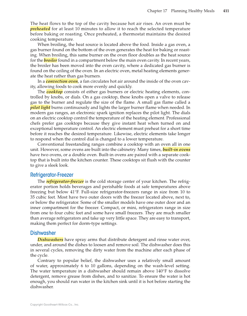 Chapter 17 Planning Healthy Meals 411 Copyright Goodheart-Willcox Co., Inc. The heat flows to the top of the cavity because hot air rises. An oven must be preheated for at least 10 minutes to allow it to reach the selected temperature before baking or roasting. Once preheated, a thermostat maintains the desired cooking temperature. When broiling, the heat source is located above the food. Inside a gas oven, a gas burner found on the bottom of the oven generates the heat for baking or roast- ing. When broiling, this same burner on the oven floor doubles as the heat source for the broiler found in a compartment below the main oven cavity. In recent years, the broiler has been moved into the oven cavity, where a dedicated gas burner is found on the ceiling of the oven. In an electric oven, metal heating elements gener- ate the heat rather than gas burners. In a convection oven, a fan circulates hot air around the inside of the oven cav- ity, allowing foods to cook more evenly and quickly. The cooktop consists of either gas burners or electric heating elements, con- trolled by knobs, or dials. On a gas cooktop, these knobs open a valve to release gas to the burner and regulate the size of the flame. A small gas flame called a pilot light burns continuously and lights the larger burner flame when needed. In modern gas ranges, an electronic spark ignition replaces the pilot light. The dials on an electric cooktop control the temperature of the heating element. Professional chefs prefer gas cooktops because they give instant heat when turned on and exceptional temperature control. An electric element must preheat for a short time before it reaches the desired temperature. Likewise, electric elements take longer to respond when the control dial is changed to a lower temperature. Conventional freestanding ranges combine a cooktop with an oven all in one unit. However, some ovens are built into the cabinetry. Many times, built-in ovens have two ovens, or a double oven. Built-in ovens are paired with a separate cook- top that is built into the kitchen counter. These cooktops sit flush with the counter to give a sleek look. Refrigerator-Freezer The refrigerator-freezer is the cold storage center of your kitchen. The refrig- erator portion holds beverages and perishable foods at safe temperatures above freezing but below 41°F. Full-size refrigerator-freezers range in size from 10 to 35 cubic feet. Most have two outer doors with the freezer located above, next to, or below the refrigerator. Some of the smaller models have one outer door and an inner compartment for the freezer. Compact, or mini, refrigerators range in size from one to four cubic feet and some have small freezers. They are much smaller than average refrigerators and take up very little space. They are easy to transport, making them perfect for dorm-type settings. Dishwasher Dishwashers have spray arms that distribute detergent and rinse water over, under, and around the dishes to loosen and remove soil. The dishwasher does this in several cycles, removing the dirty water from the machine after each phase of the cycle. Contrary to popular belief, the dishwasher uses a relatively small amount of water, approximately 6 to 10 gallons, depending on the wash-level setting. The water temperature in a dishwasher should remain above 140°F to dissolve detergent, remove grease from dishes, and to sanitize. To ensure the water is hot enough, you should run water in the kitchen sink until it is hot before starting the dishwasher.