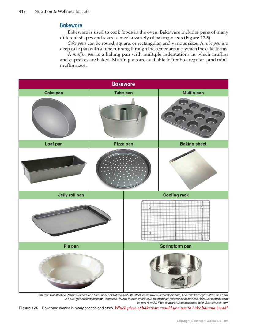 416 Nutrition & Wellness for Life Copyright Goodheart-Willcox Co., Inc. Bakeware Bakeware is used to cook foods in the oven. Bakeware includes pans of many different shapes and sizes to meet a variety of baking needs (Figure 17.5). Cake pans can be round, square, or rectangular, and various sizes. A tube pan is a deep cake pan with a tube running through the center around which the cake forms. A muffin pan is a baking pan with multiple indentations in which muffins and cupcakes are baked. Muffin pans are available in jumbo-, regular-, and mini- muffin sizes. Bakeware Bakeware Cake pan Tube pan Muffin pan Loaf pan Pizza pan Baking sheet Jelly roll pan Cooling rack Pie pan Springform pan Top row: Constantine Pankin/Shutterstock.com AnnapolisStudios/Shutterstock.com ffolas/Shutterstock.com 2nd row: kavring/Shutterstock.com Joe Gough/Shutterstock.com Goodheart-Willcox Publisher 3rd row: cretolamna/Shutterstock.com Kitch Bain/Shutterstock.com bottom row: AS Food studio/Shutterstock.com ffolas/Shutterstock.com Figure 17.5 Bakeware comes in many shapes and sizes. Which piece of bakeware would you use to bake banana bread?