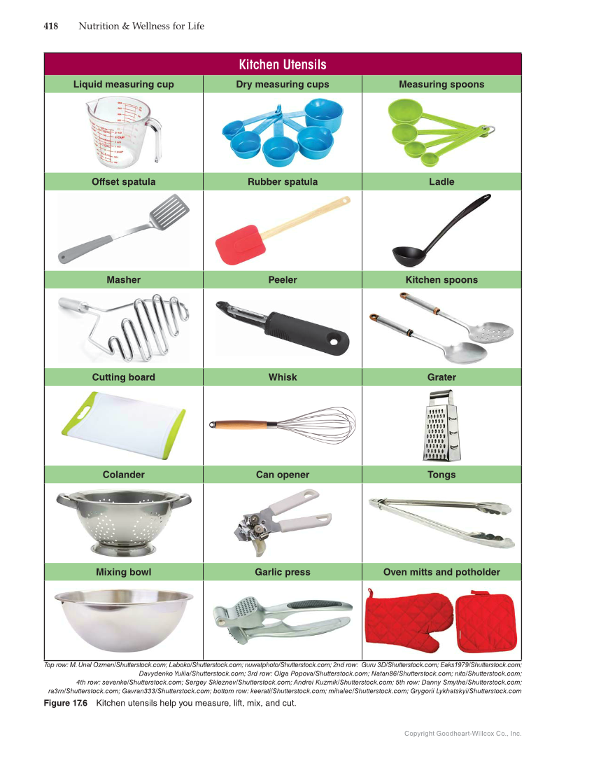 418 Nutrition & Wellness for Life Copyright Goodheart-Willcox Co., Inc. Kitchen Utensils Kitchen Utensils Liquid measuring cup Dry measuring cups Measuring spoons Offset spatula Rubber spatula Ladle Masher Peeler Kitchen spoons Cutting board Whisk Grater Colander Can opener Tongs Mixing bowl Garlic press Oven mitts and potholder Top row: M. Unal Ozmen/Shutterstock.com Laboko/Shutterstock.com nuwatphoto/Shutterstock.com 2nd row: Guru 3D/Shutterstock.com Eaks1979/Shutterstock.com Davydenko Yuliia/Shutterstock.com 3rd row: Olga Popova/Shutterstock.com Natan86/Shutterstock.com nito/Shutterstock.com 4th row: sevenke/Shutterstock.com Sergey Skleznev/Shutterstock.com Andrei Kuzmik/Shutterstock.com 5th row: Danny Smythe/Shutterstock.com ra3rn/Shutterstock.com Gavran333/Shutterstock.com bottom row: keerati/Shutterstock.com mihalec/Shutterstock.com Grygorii Lykhatskyi/Shutterstock.com Figure 17.6 Kitchen utensils help you measure, lift, mix, and cut.